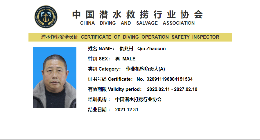 Home > Honor Qualification Co., Ltd. > 潜水作业安全员证书