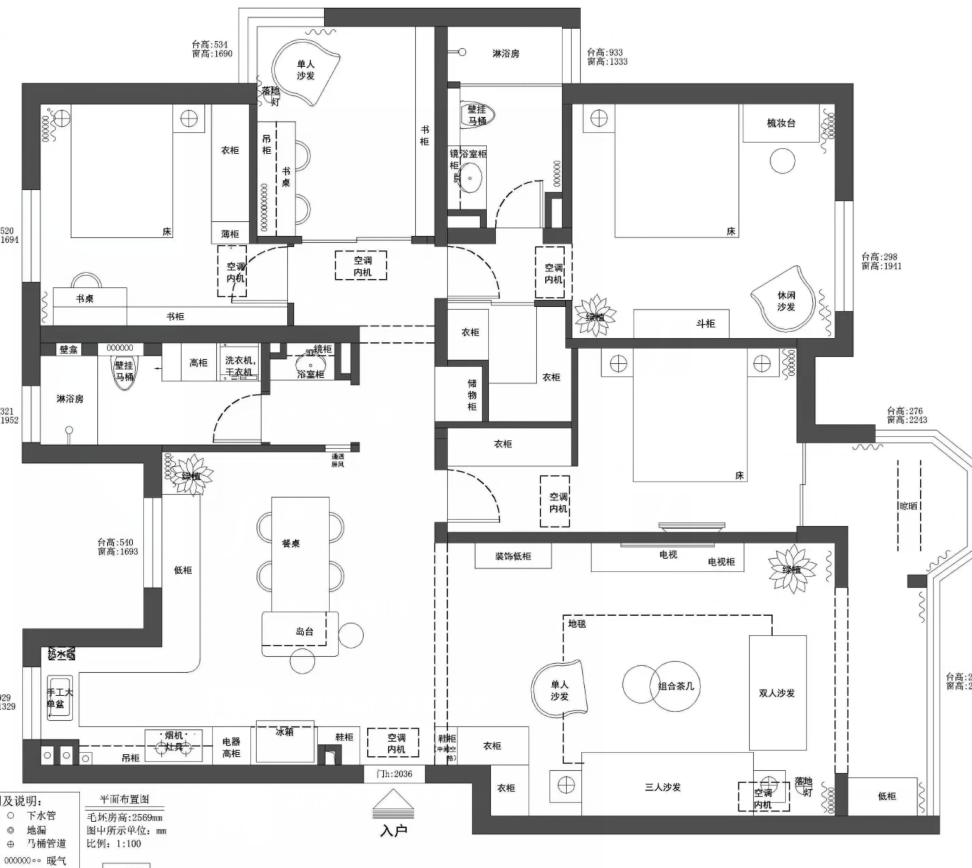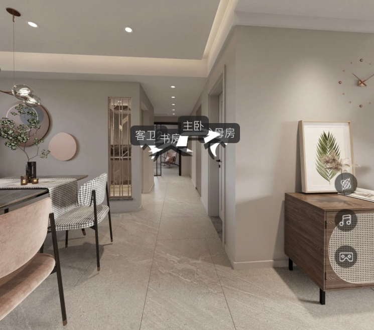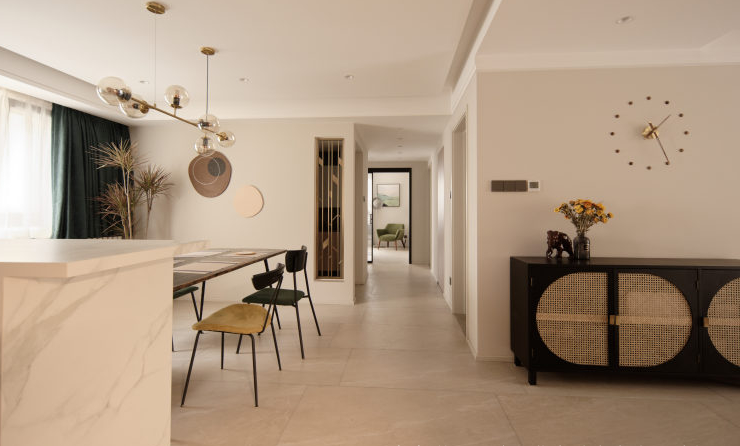 The original structure of the case featured narrow hallways between the living and dining areas, with the kitchen lacking ample storage space. After placing the dining table and chairs, the hallway was already too narrow for comfortable movement. The guest bedroom hallway cabinet was not utilized efficiently, resulting in wasted space. The master bedroom was short on storage, and the hallway between the master bedroom, study, and second bedroom was somewhat elongated, not making the most of the long passageway for functional planning or to enhance spatial perception. The bathroom area was also disorganized, causing interference during use. The designer chose to maintain the openness of the space upon entering, opting not to install a screen or what is commonly referred to as a foyer. Instead, various storage functions were arranged along the walls, keeping the area as open as possible, which is actually very effective in small apartments. The guest bathroom dry area did not have the partition wall removed but was partially hollowed out, ensuring openness while preserving privacy. The sink area was relatively cluttered during normal use, but this approach preserved the integrity of the main space's effect. The wall between the study and the hallway was removed to increase the sense of space. To ensure the master bedroom's spaciousness, the master bedroom's wardrobe area borrowed some space from the guest bedroom. This approach made full use of the户型 island area, making it usable in all directions, resulting in a very high space utilization rate. It also allowed the side of the bed to be freed from the traditional wardrobe layout. In the bathroom area, separation was made where possible, and standing options were utilized.