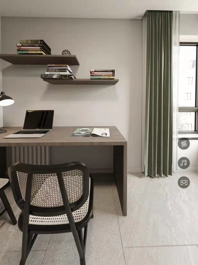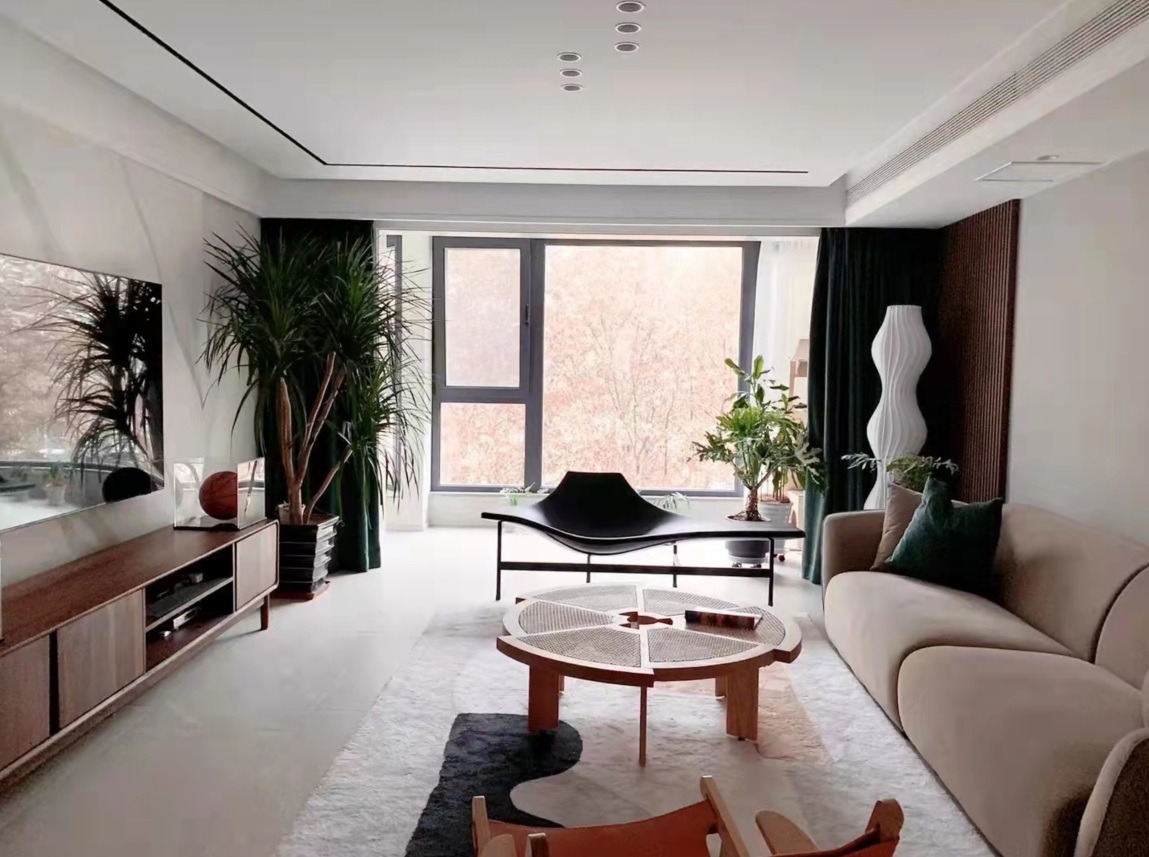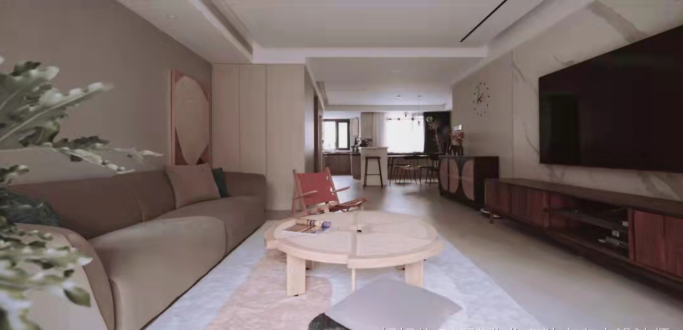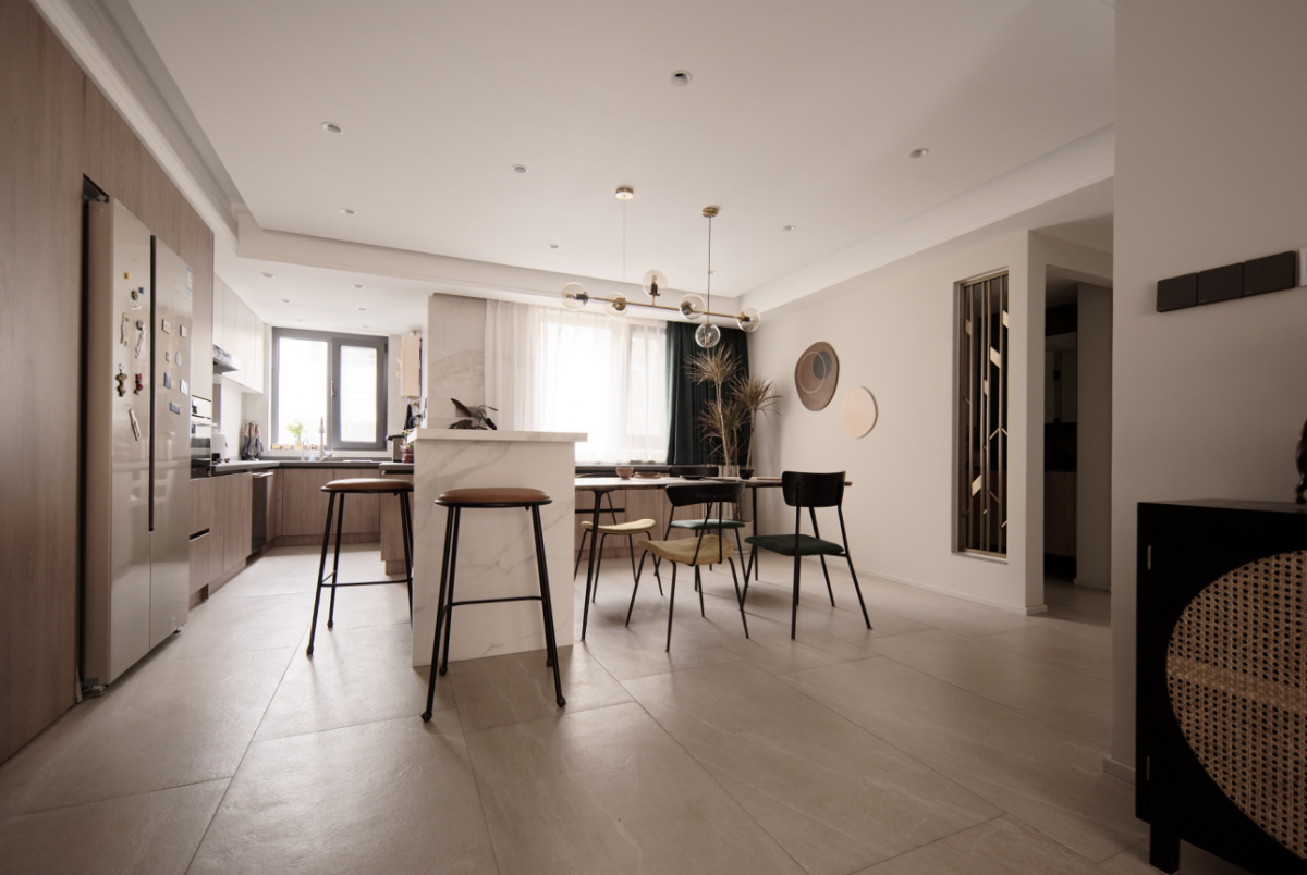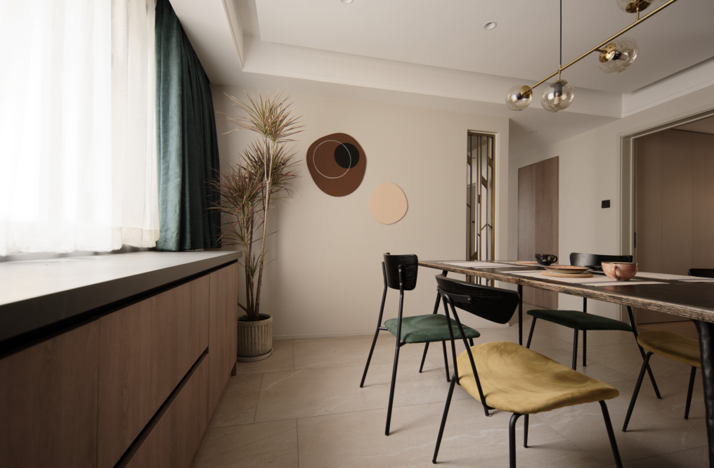The previously fragmented windows in the living room have been transformed to create a complete and spacious design with unobstructed views. The openness between the living, dining, and kitchen areas greatly enhances the comfort and interaction of the户型. Materials are all chosen from the matte series for an eco-friendly touch. The environment is designed to be soft and relaxing, with a hint of leisure. Under the calming ambiance of earthy tones,局部 bright colors add vitality and fun to the space.