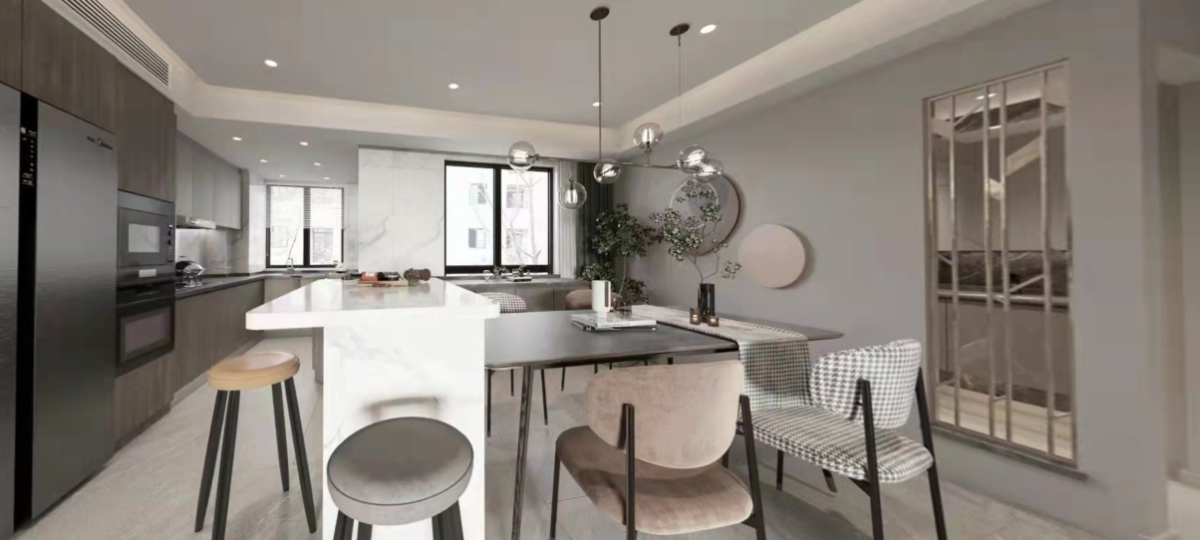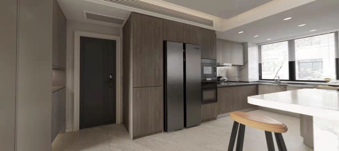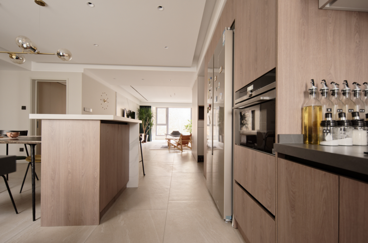 Open the kitchen, storage features run along the wall. Enjoy a spacious open area. Extend the significance of the foyer to the background decoration of the study. In choosing the entryway space, prioritize either vertical storage or openness, while satisfying the storage needs. Here, we opt for space dominance.