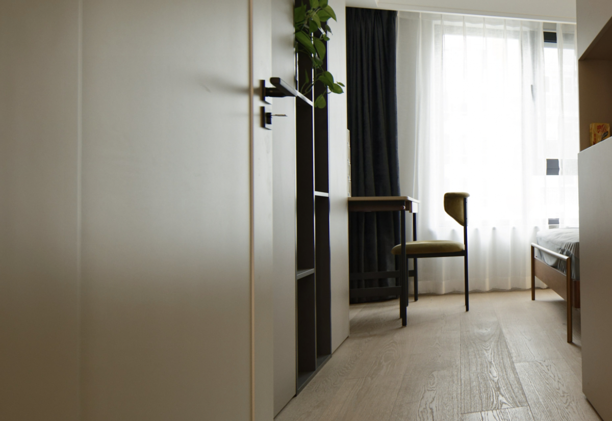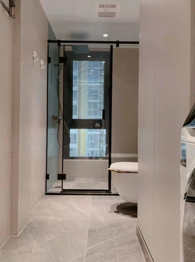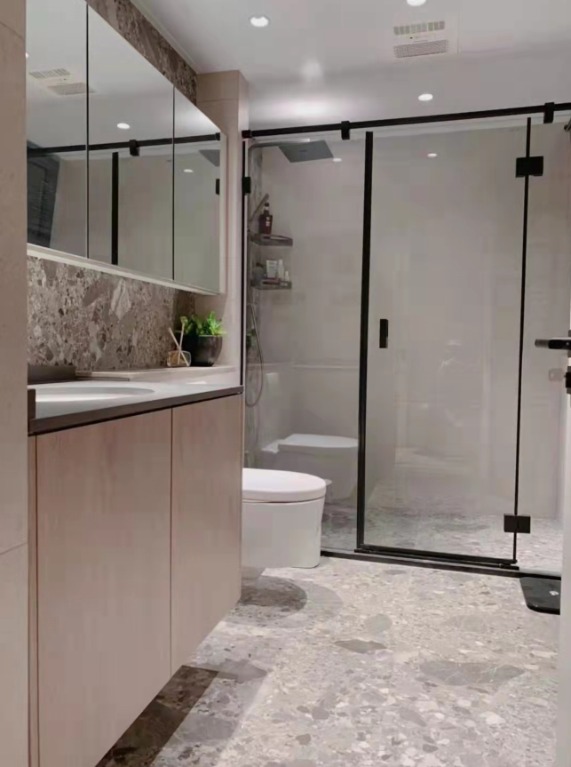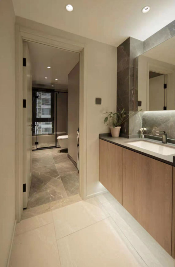 Guest bathrooms retain the exterior washbasin design for convenience, allowing for seamless interaction between the inside and outside spaces. The dryer function of the washing machine can be placed in the standing space when needed, with the noise and duration of the dryer being minimized to not disrupt the public area's living experience. Tiles are installed using large-size tiles, applied thinly for a simple and elegant look. The medicine cabinet ensures the cleanliness of the bathroom cabinet area. There is basically no failure in the transition from before to after occupancy. The high cabinet next to the washing machine houses various equipment and a laundry basket, all designed to ensure functionality. A preference for matte tiles has always been maintained. The main color scheme is plain with occasional textures or colors for accents. Internal blinds are used for the windows, although there is a relatively low risk of failure, they were chosen to enhance the living experience.