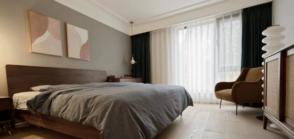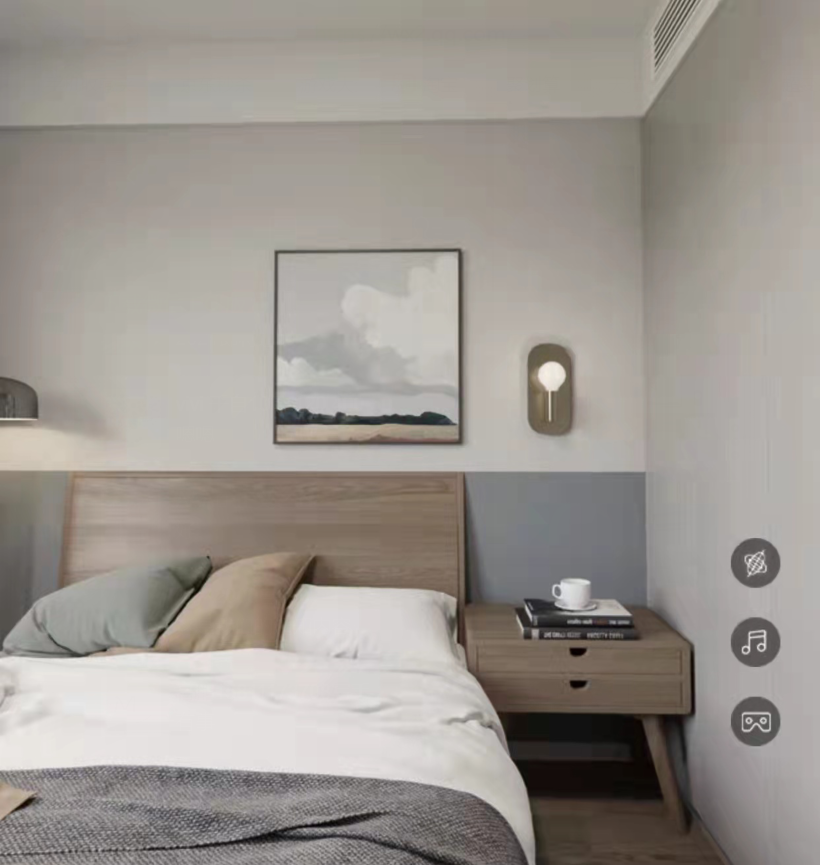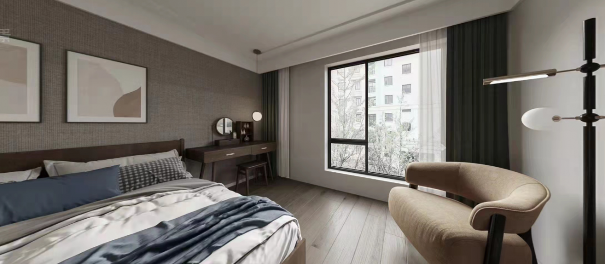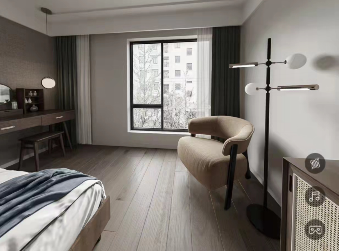 The master bedroom's space design utilizes the guest bedroom to create a walk-in closet, ensuring the master bedroom remains neat and grand. Lighting continues with the traditional two-mode design, offering both bright and ambient lighting options.