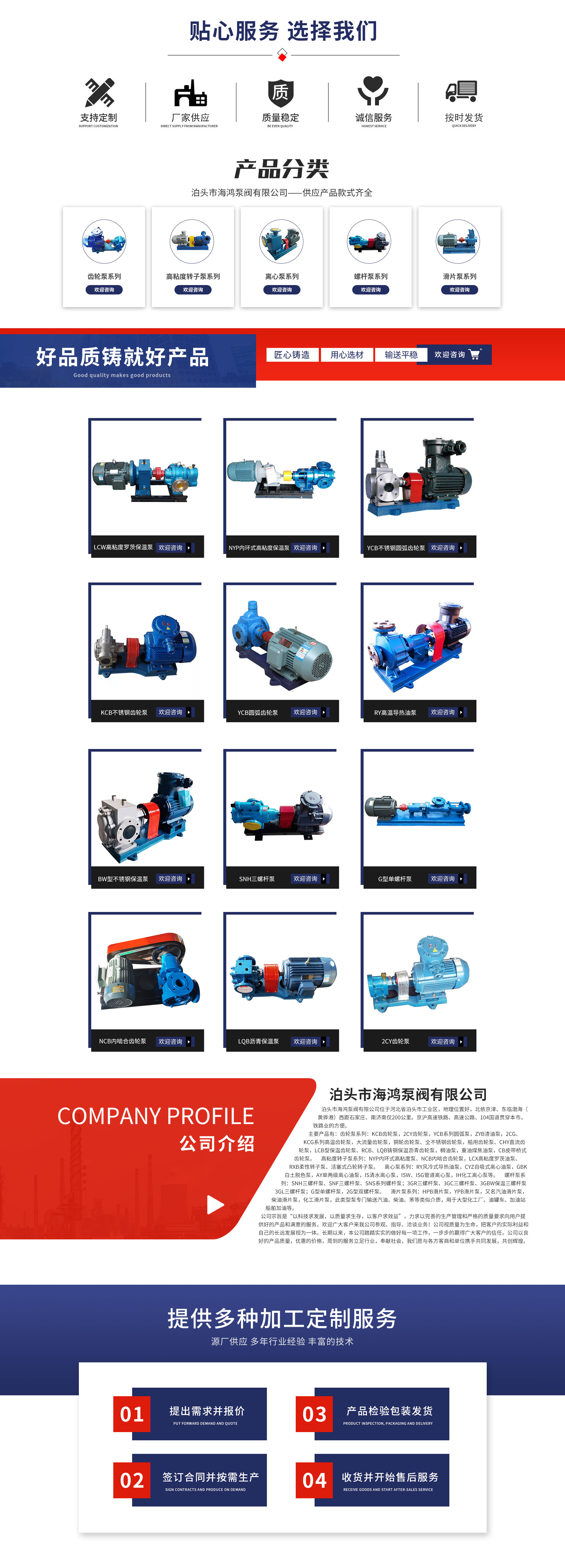 Bo tuo City Haihong Pump Valve Co., Ltd. is located in the Industrial Zone of Bo tuo City, Hebei Province, boasting a prime location with easy access to Beijing and Tianjin in the north, the Bohai Sea (Huanghua Port) in the east, and being just 200 kilometers away from Shijiazhuang in the west and Jinan in the south. The Beijing-Shanghai High-Speed Railway, highways, and National Highway 104 run through the city, offering convenient railway transportation.Our main products include:Gear Pump Series: KCB Gear Pumps, 2CY Gear Pumps, YCB Series Arc Pumps, ZYB Sludge Oil Pumps, 2CG, KCG Series High-Temperature Gear Pumps, High-Flow Gear Pumps, Copper Wheel Gear Pumps, Full Stainless Steel Gear Pumps, Marine Gear Pumps, CHY DC Gear Pumps, LCB Insulated Gear Pumps, RCB, LQB Cast Steel Insulated Asphalt Gear Pumps, Thick Oil Pumps, Heavy Oil and Coal Tar Pumps, CB Belt Bridge Gear Pumps.High Viscosity Rotor Pump Series: NYP Annular High Viscosity Pump, NCB Internal Mesh Gear Pump, LCX High ...