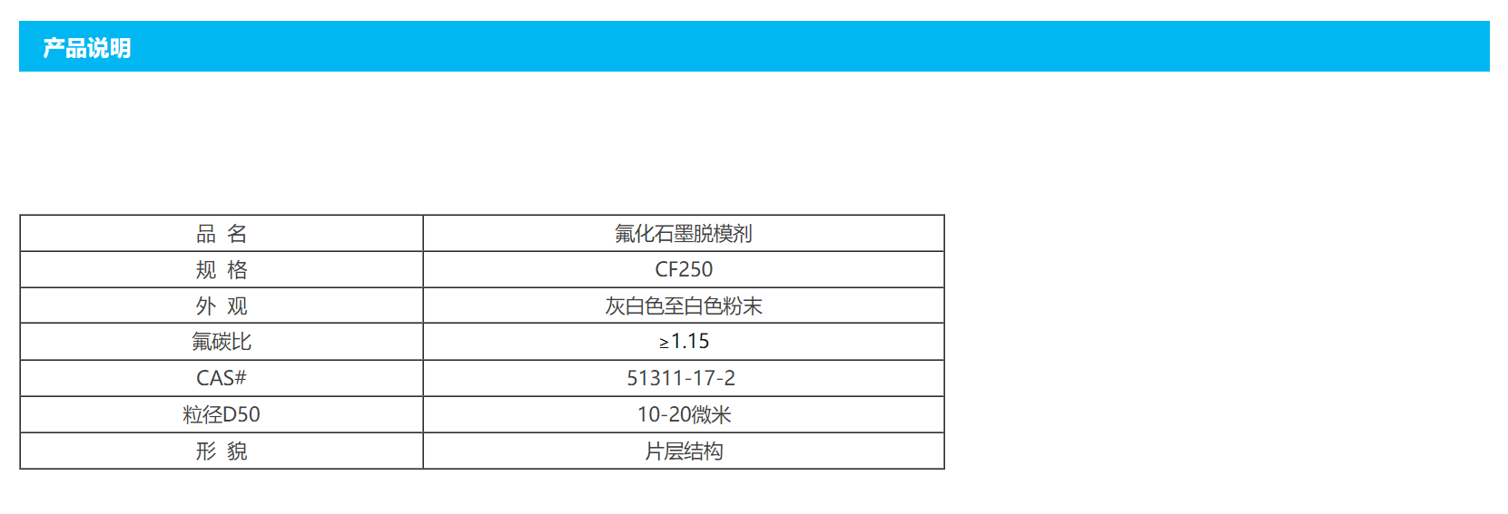 特性:高氟化度的氟化石墨,外观白色粉末,流动性好,具有绝缘、耐腐蚀、超疏水防水性,耐高温350度以上,耐击穿电压高。