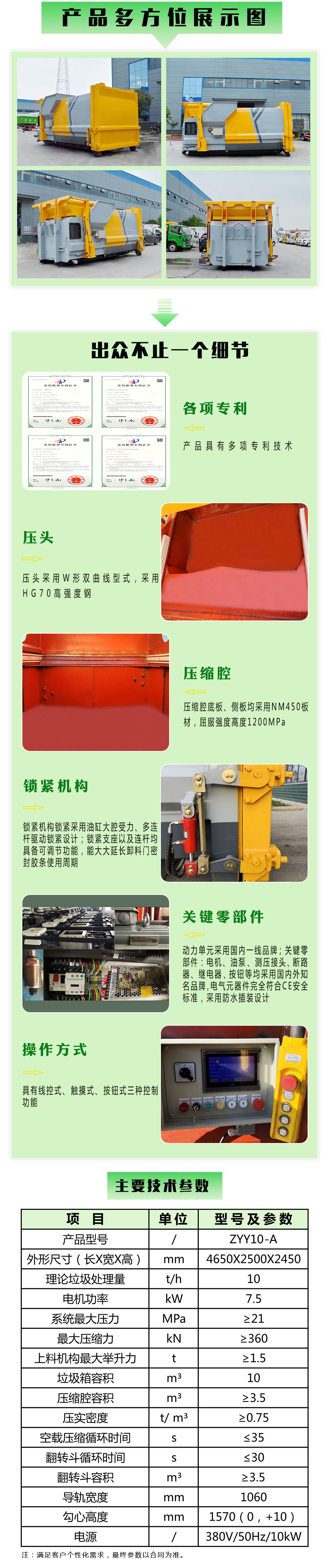 The portable waste compactor utilizes horizontal compression technology to compact loose waste, reduce moisture, and decrease volume, which is then transported via a removable container on a truck. This model is compact, occupying minimal space, and is easy to operate, reliable, mobile, and versatile, significantly enhancing transportation efficiency, improving the environment at transfer stations, and saving operational costs. The high level of automation greatly reduces the physical strain on workers.