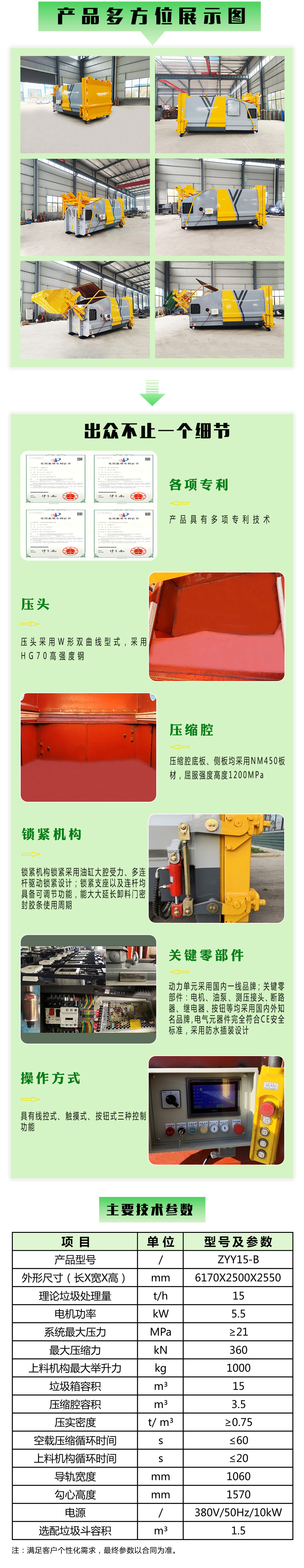 ●智能操作**系统采用高集成PLC**,具有多处自锁、互锁功能及自动压缩循环,具有满载**示、急停、强退和安全**示等功能;设有