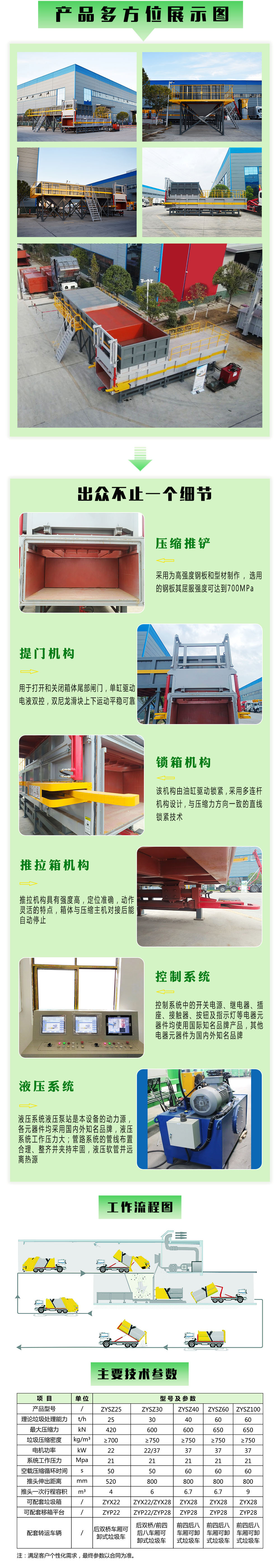 中大型水平直压式垃圾压缩转运成套设备采用国际**的水平直压式压缩工艺,具有综合性能优、适应性强、可“一机多箱、机箱分离”、车辆利用率高的特点,可根据垃圾处理高峰时段的要求合理配置单车位卸料槽、双车位推头式卸料槽;适应自卸垃圾车、小型垃圾压缩车以及垃圾转运车等多种垃圾收集方式的卸料需求,可采取简易配置或选装智能称重计量系统、**指挥系统、除尘除臭系统、监控管理系统、车辆GPS系统,确保实现转运站投入小及整个系统运营成本低、垃圾处理效率高、环保无污染;适用于日处理150-1000t及以上的中、大型垃圾站。