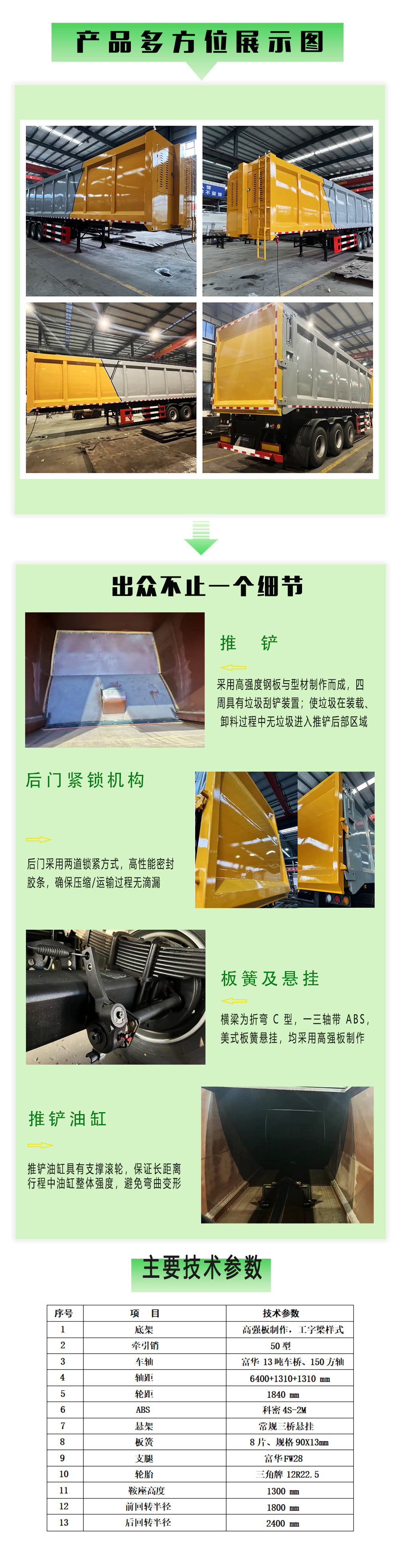 ★Push Broom: Made of high-strength steel plates and profiles, equipped with a waste scraper on all sides; preventing waste from entering the rear area of the push broom during loading and unloading.