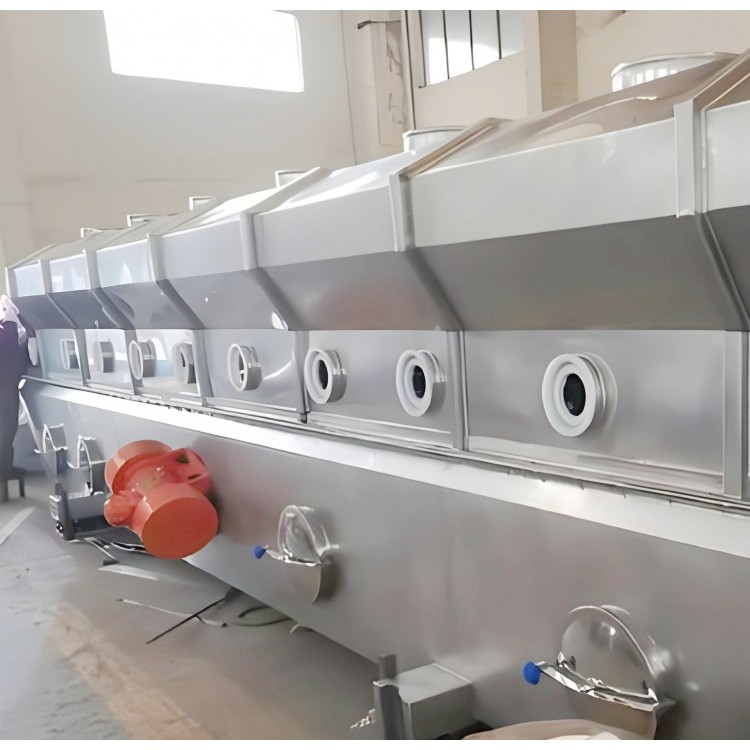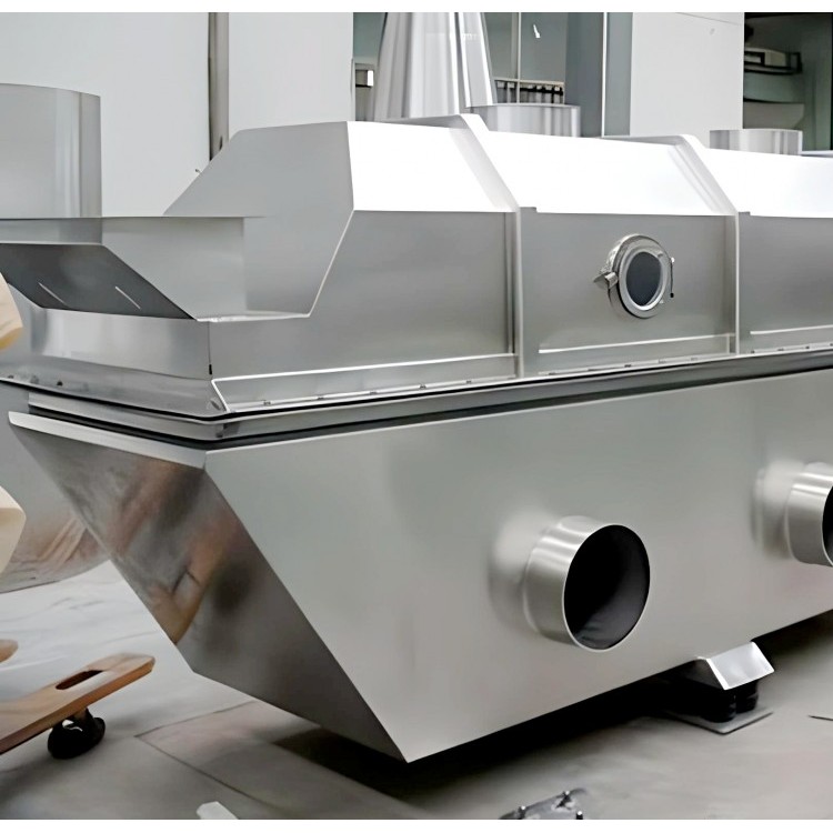 Material enters the machine through the feeding port and is continuously propelled forward in a horizontal direction under the action of vibration force. Hot air passes upward through the fluidized bed and heat exchanges with the wet material. The wet air, after being dusted by the cyclone separator, is exhausted through the exhaust port. The dried material is discharged through the discharge port.