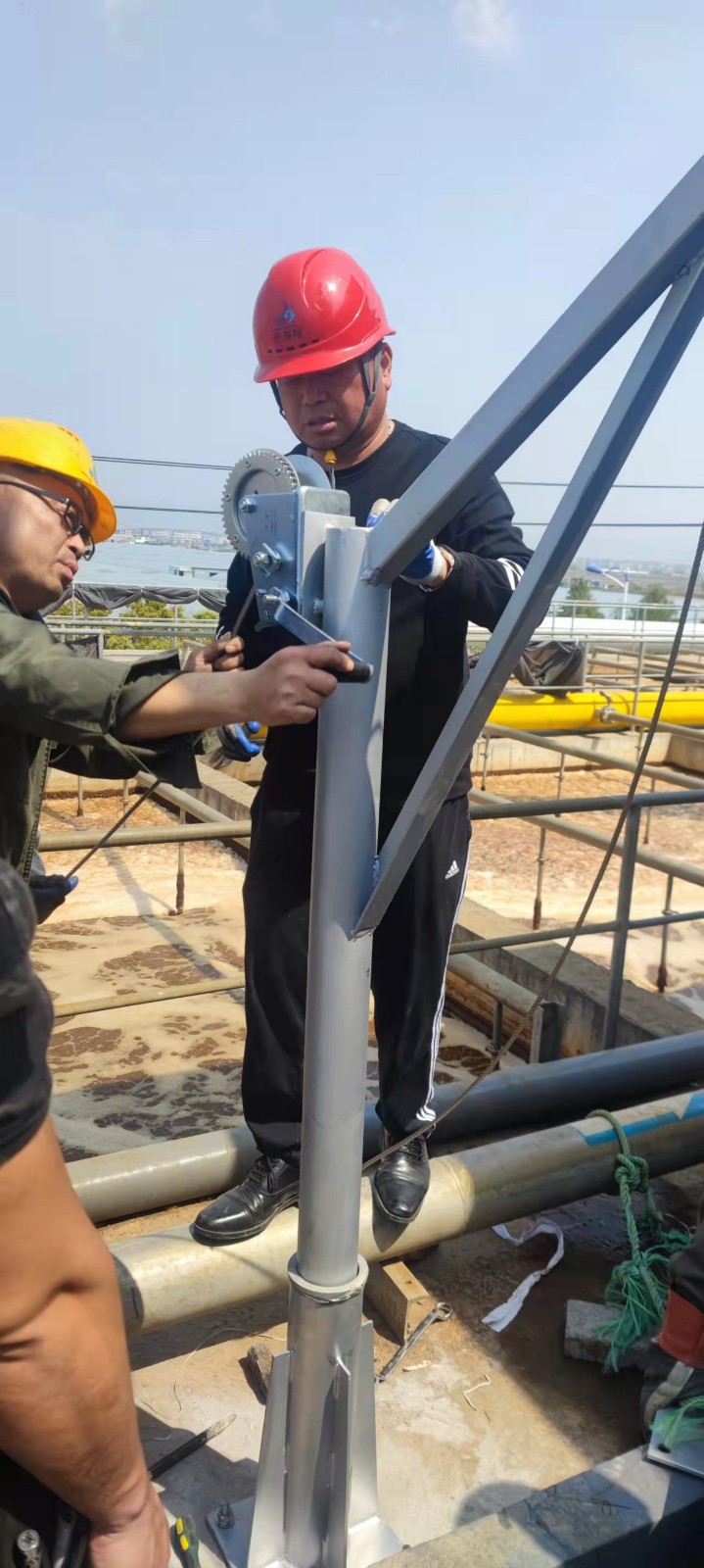 Installation Method 2: Composed mainly of a hand winch, lifting frame, straight lifting ring chain, bracket, guide rod, intermediate support blade (not required for pool depth ≤ 6 meters), limit frame, and base. The guide rod is positioned on the bracket, intermediate support frame, and base concentric axes by means of a hinge shaft welded to the body, and it can rotate ±60° within the horizontal plane to accommodate different directions of mixing or propulsion, eliminating dead zones in the pool and ensuring better water flow operation. The submersible mixer moves up and down the guide rod via guide wheels. The lifting frame can be mounted on the bracket and can rotate 360° around its positioning axis for easy installation and maintenance. To enhance the reliability of the submersible mixer during operation and to reduce vibrations, the limit frame is typically welded directly to the guide rod, with vibration-dampening blocks added between the submersible mixer and the limit frame. The limit frame can be welded to the guide rod either before shipment or during on-site installation. Unless the customer has special requirements, it is usually welded before shipment.