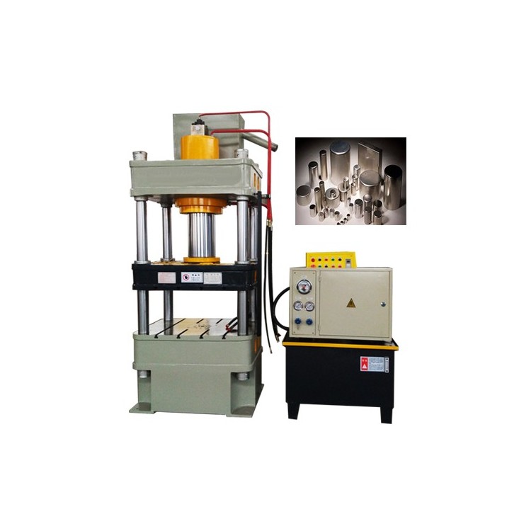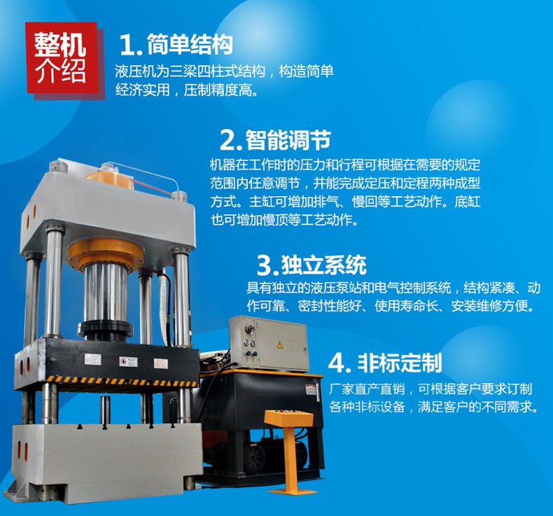 Four-column hydraulic press performance features - The 200-ton hydraulic press body is designed with a three-beam four-column structure. The hydraulic system employs an integrated control with a reliable electric control system using plug-in valves, offering wide versatility for the pressing and forming of various plastic materials, such as extrusion, bending, flanging, and stretching. It can also be used for the molding of various plastics and powdered products, enabling both stroke and pressure forming processes, and featuring pressure-holding delay functions. It is widely applicable with good economic performance. If the hydraulic press is used for drop forging or cutting processes, it should be equipped with a cutting cushioning device to eliminate or reduce the impact and noise during the moment of material breakage.