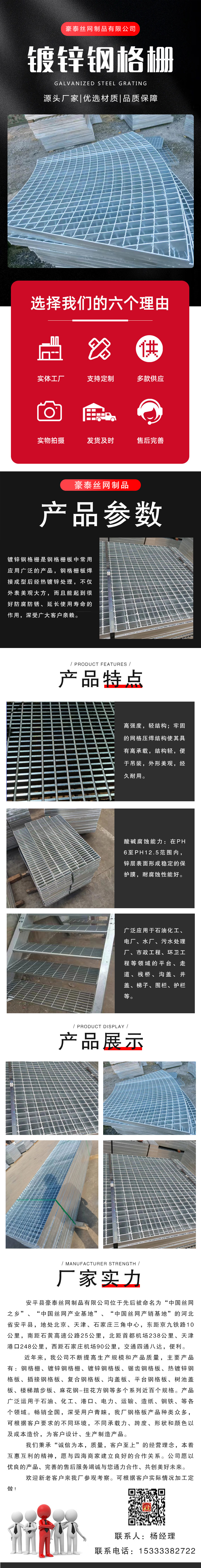 (3) Hot-Dipped Galvanized Steel Grating: Material: Q23 or stainless steel, available in flat, anti-slip toothed, and I-section designs. Common sizes include 20*5, 25*5, 25*3, 32*5, 32*5, 40*5, 40*3, 50*5, 65*5, 75*6, 100*8, and 100*10.