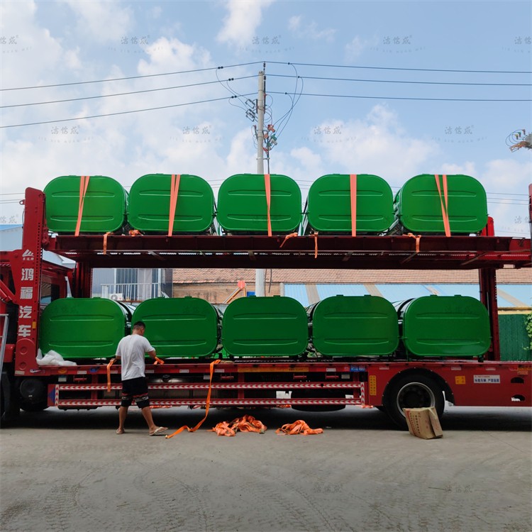 This customer's order includes all-green hook arm-style circular arc waste bins, crafted using the vacuum forming process. The top features an elegant circular design, offering a larger capacity than box-style bins. The bins are equipped with two hinged doors on the top for waste disposal, with the rear door manually operated and locked. The body is made of carbon steel welding, and the rear door is fitted with oil-resistant, corrosion-resistant, and aging-resistant sealing strips to minimize leakage during collection and transportation. The bottom is equipped with wheels, reducing contact with the ground and effectively preventing rust. The lid-sealed design of the waste bins prevents secondary environmental pollution during collection and transportation, as well as prevents rainwater entry, odor dispersion, and breeding of various insects.