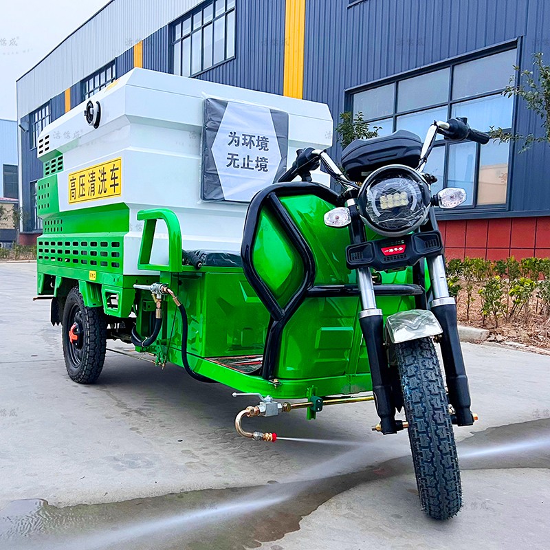 The Electric Three-Wheeled High-Pressure Cleaning Vehicle, also known as the Small Multi-functional High-Pressure Cleaning Vehicle, utilizes a gasoline high-pressure pump to increase pressure, and then cleans ground oil stains, trash bins, guardrails, and more with high-pressure water streams. It can also be used for cleaning urban sewers, pipeline deposits, clearing clogged ditches, and removing wall advertisements. Its main components include the tank, high-pressure pump, and hydraulic system. Key functions include front冲洗 (sweeping), rear洒 (spraying), and high-pressure water hoses. The Electric Three-Wheeled High-Pressure Cleaning Vehicle primarily uses the strong pressure generated by the high-pressure water stream to remove stubborn stains and achieve cleaning.