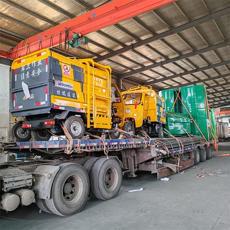 This shipment includes 3 trapezoidal 6-cubic-yard hook arm trash bins and 2 film-compression 3-cubic-yard hook arm bins. The colors, shapes, and promotional slogans, as well as the volumes, are all customized according to customer requirements. These bins are bright and aesthetically pleasing, featuring features like moisture-proof, anti-corrosion, anti-rodent, anti-rust, high-temperature resistance, and easy cleaning. The rear door of the hook arm bins is fitted with oil-resistant, corrosion-resistant, and aging-resistant sealing strips to ensure no leakage during waste collection and transportation. They are widely used in outdoor public places such as municipal streets, garden communities, industrial areas, campuses, and construction sites. The electric three-wheeled hanging drum garbage trucks sent out this time are mainly suitable for residential streets, property sanitation, and rural waste collection. They are convenient and lightweight, equipped with a hydraulic system for time and effort savings. One truck can be paired with dozens of bins, enabling simultaneous operation of one truck with multiple bins, achieving circular transportation, and significantly enhancing the vehicle's transportation capacity. They are a high-performance, low-energy-consuming, noiseless, and environmentally friendly green vehicle.