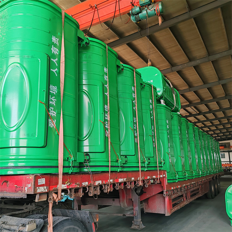 Our hopper trash bins, also known as film compression bins, detachable hopper bins, portable bins, and household waste collection bins, can be customized according to customer requirements in terms of volume, size, color, and promotional slogans. Today's shipment features bins with a standard volume of 3 cubic meters, equipped with a pair of swivel wheels on the left and a pair of directional wheels on the right. This design ensures both flexibility and stability during movement, making it easier to maneuver. The support rod of the feeding opening has been thickened and reinforced to prevent sudden slipping during waste disposal, enhancing safety. These bins are widely used in outdoor public places such as rural streets, garden communities, industrial areas, campuses, construction sites, and more, offering a wide range of application scenarios.