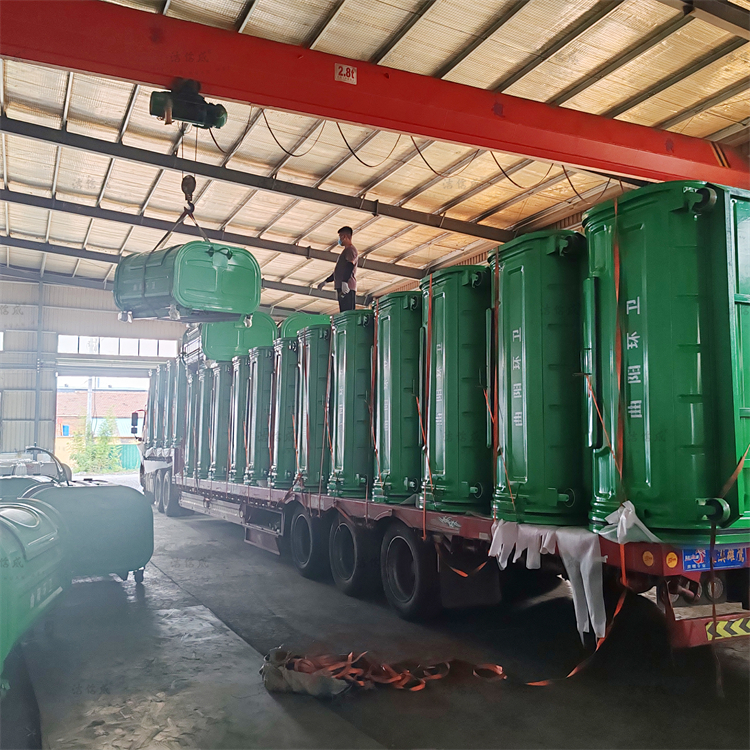 Customers in Baoding City, Hebei Province have ordered 80 sealed hook arm waste bins, which are being shipped in two batches. Today, the first batch of one truck is dispatched. These bins feature two waste disposal openings for added convenience. The color is the commonly used green, symbolizing ecological civilization and environmental protection, enhancing people's awareness of environmental protection. The sealed areas use rubber strips to prevent secondary pollution during transportation. The bins have doors locked by latches on both sides, serving as the waste disposal channels, which are compatible with small hook arm trucks. After disposal, there is no waste left inside. The bin has a capacity of 3 cubic meters, a size commonly seen, with an upper and lower rounded shape, appearing round and full, without sharp edges to injure people. The material chosen is carbon steel, known for its high hardness and wear resistance, resulting in a longer service life.