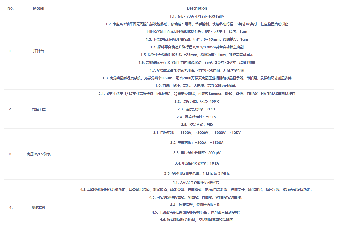Power Device Measurement System: Primarily includes probe station, high-temperature chuck, high-voltage IV/CV meter, and test software