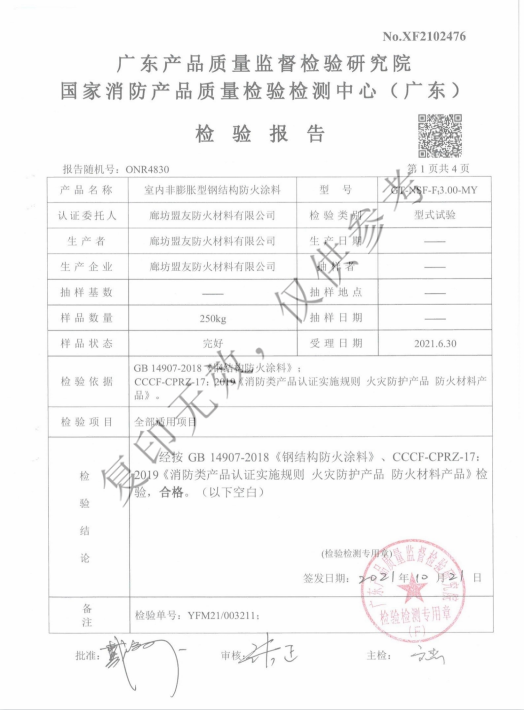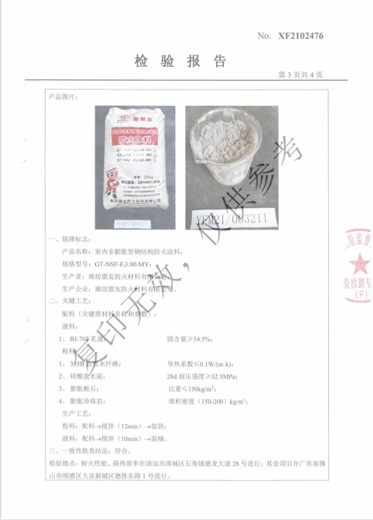 GT-NSF-F3.00-MY室内非膨胀型钢结构防火涂料_Honor Qualification Co., Ltd._Langfang盟友Fire Retardant Materials Co., Ltd.