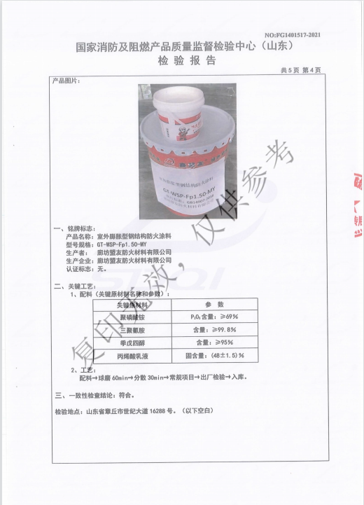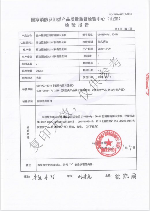 GT-WSP-Fp1.50-MY/室外膨胀型钢结构防火涂料_Honor Qualification Co., Ltd._Langfang盟友Fire Retardant Materials Co., Ltd.