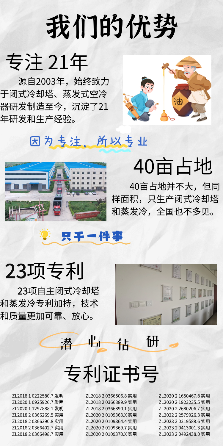 5、节省土地费用,逆流闭式冷却塔,相对开式冷却塔,无需建造大型水池,节约的大量土地费用,方便工厂整体布局,又减少水池建造费用和杜绝的漏水可能。