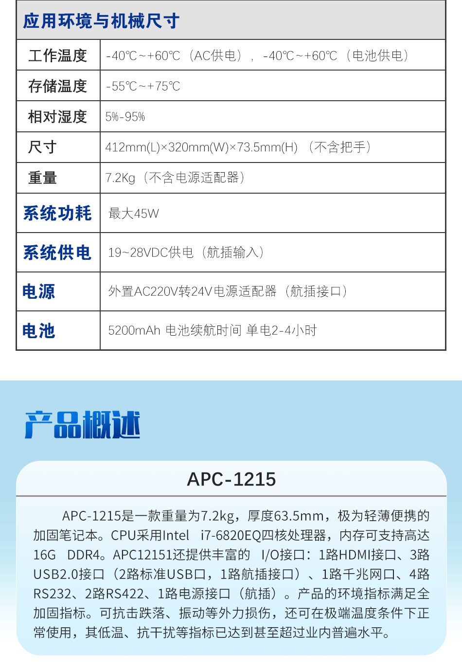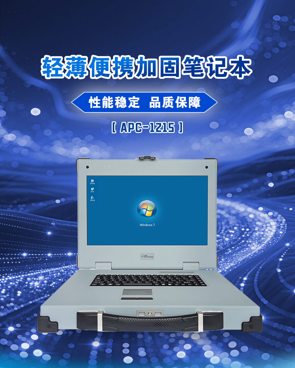 The APC-1215 is a rugged notebook weighing just 7.2kg and measuring 63.5mm thick, offering extreme portability. It features an Intel i7-6820EQ quad-core processor and supports up to 16G DDR4 memory. The APC-1215 also offers a variety of I/O interfaces: 1 HDMI port, 3 USB 2.0 ports (2 standard USB ports and 1 aviation plug), 1 gigabit Ethernet port, 4 RS232 ports, 2 RS422 ports, and 1 power port (aviation plug). The product's environmental specifications meet full ruggedization standards. It can withstand drops and vibrations, and can operate normally under extreme temperature conditions. Its low-temperature and anti-interference performance meets or exceeds industry standards.