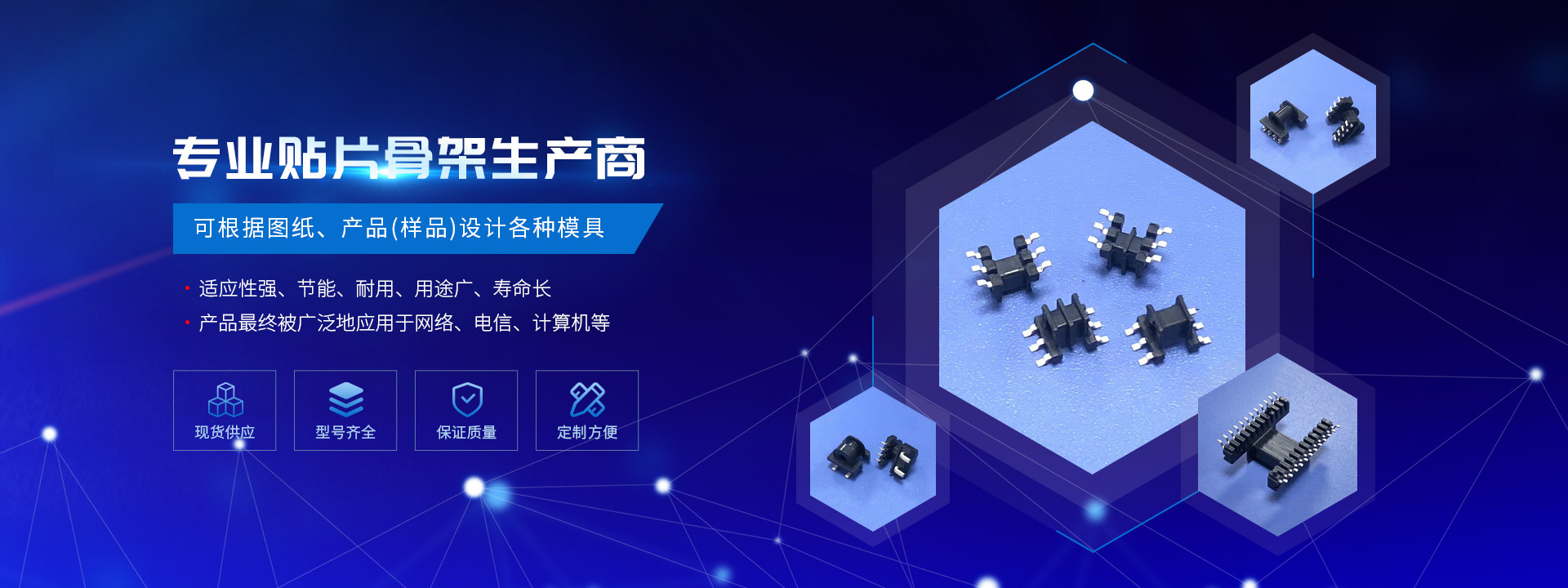 The company specializes in manufacturing various plastic electronic products, including filters, inductors, connectors, and enclosures, bases, frames, as well as cell cores and batteries for the new energy field, such as plastic and metal fasteners and rivets. Our products are widely used in networking, telecommunications, computers, communication equipment, power supplies, consumer electronics, lighting, industrial control, machinery, electricity, instruments and meters, automation, aerospace, transportation, automotive, new energy, and other technical fields.The company boasts a fleet of 50 injection molding machines, including vertical, horizontal, turntable, dual slider, and high-speed models, with a monthly capacity for SMD shells exceeding 15kkpcs; 20 pin insertion machines, with a monthly DIP capacity surpassing 10kkpcs. We produce using a variety of plastic materials as per customer requirements, such as DAP, PA, PE, LCP, PBT, PET, PPS, EPOXY, and PHENOLIC (baking varnish). ...