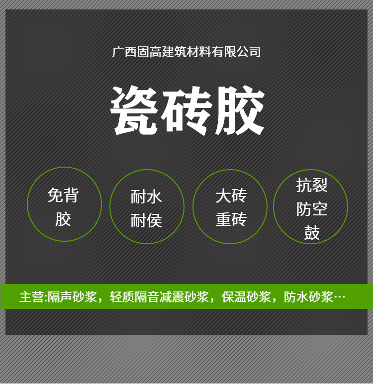 National standard tile adhesive, non-backing adhesive (the backing adhesive is an organic glue, not durable and not waterproof, you can squeeze a line on the ground and it will become brittle after being exposed to sun and rain for no more than 3 days), inorganic polymer formula, waterproof and weather-resistant, crack-resistant and anti-bubble, suitable for all types of tiles, including vitrified tiles and other non-absorbent materials, customizable for anti-slip, low flexibility, waterproof grade, super-large 3-meter heavy tiles, and various other products for different applications.