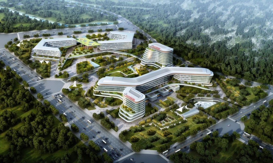 Administrative Building: Offers office areas and meeting rooms, while also showcasing the hospital's image with a reception area and display wall.