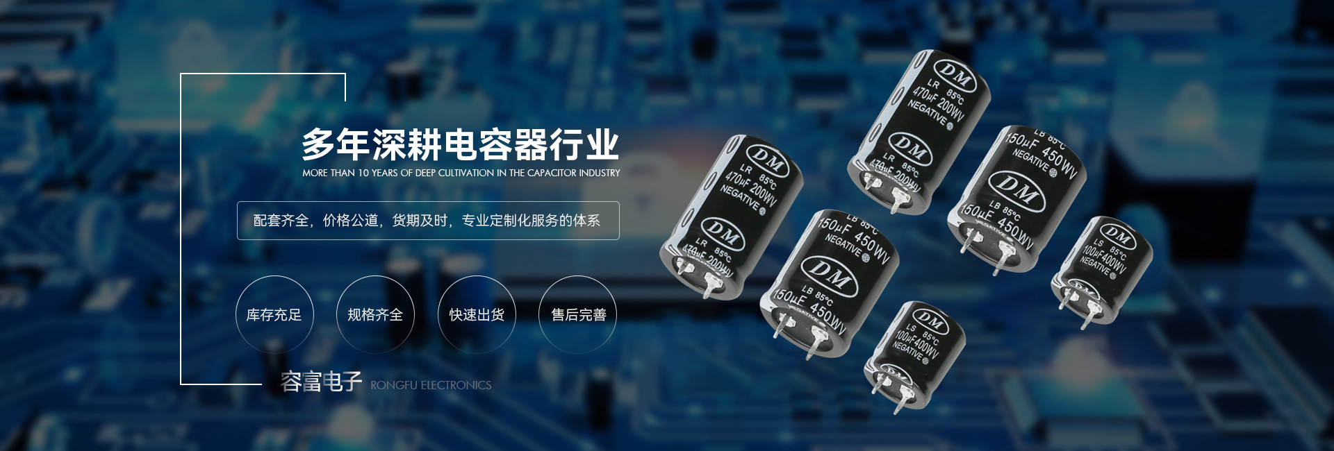 Dongguan Rongfu Electronics Co., Ltd. is a professional enterprise specializing in the sale of a full range of aluminum electrolytic capacitors and also acts as an agent for DM Dongci brand capacitors. Our production team consists of professionals with years of experience in the field. Relying on industry expertise and the advancement of new material technology, we continuously improve our manufacturing processes and ensure quality control at every stage. We provide customers with high-quality products. Our factory adheres to a high-standard environmental control system and can deliver halogen-free products (HF) upon customer request. We conduct pre-assessments of potential environmental impacts during the production process, uphold green production mechanisms, and prioritize occupational health and safety.Product Features: High precision, miniaturization, withstanding extreme temperatures, high current resistance, and high reliability. Widely used in various fields such as househol...