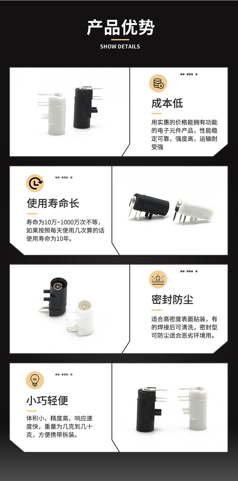 TYPE-C母座、震动开关、拨动开关、电源插座、轻触开关、耳...