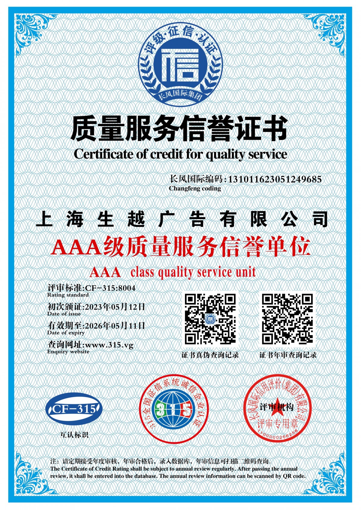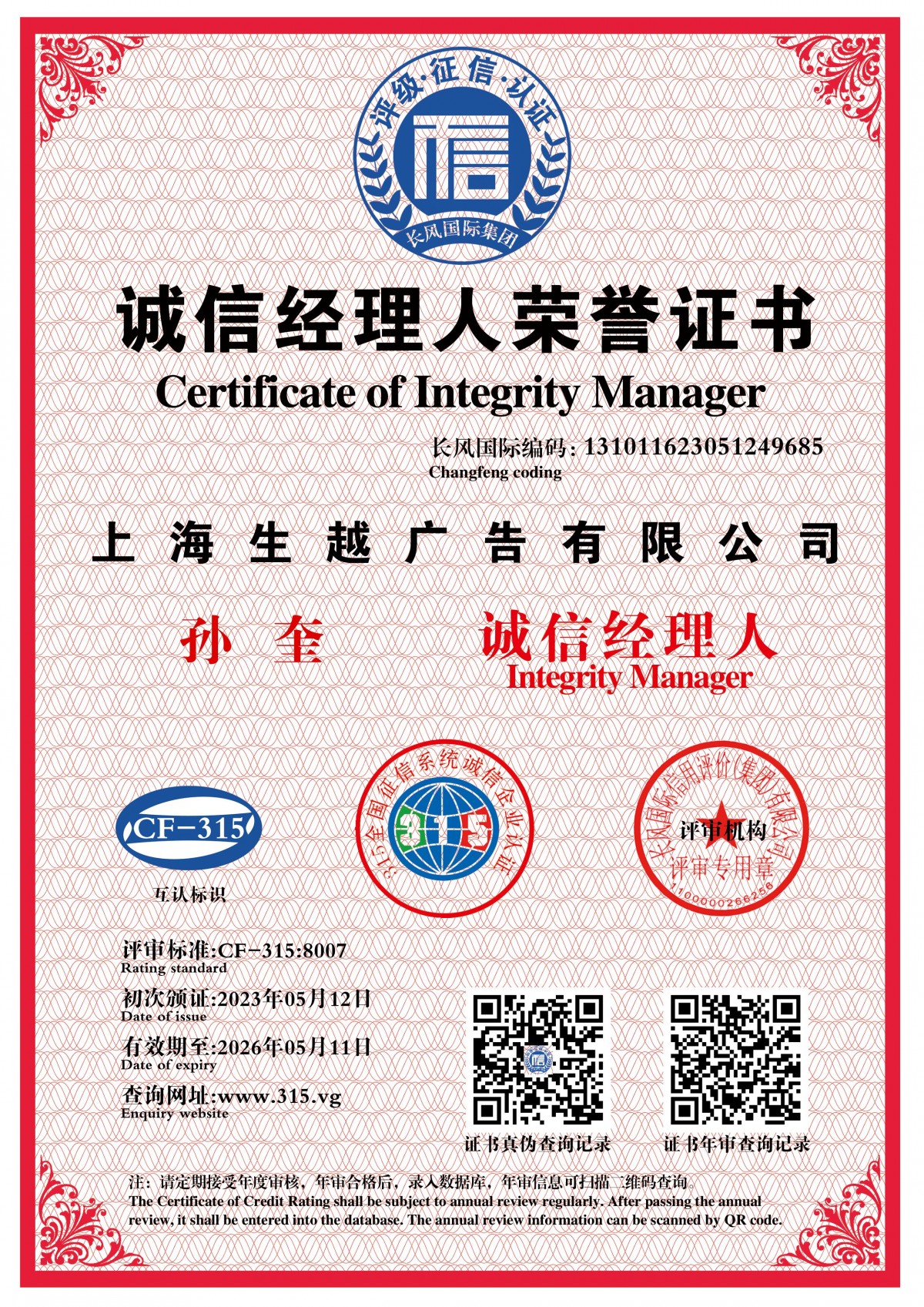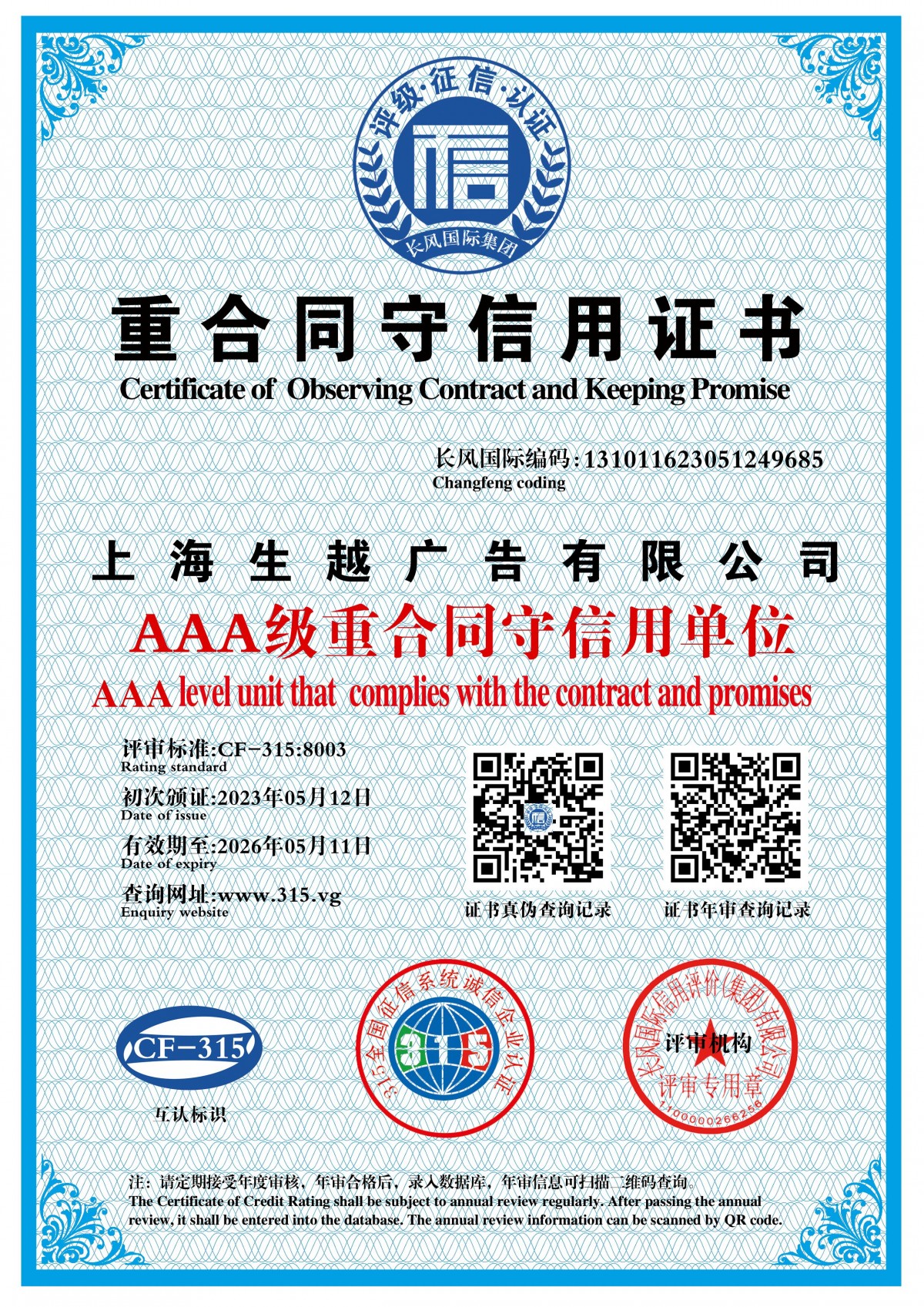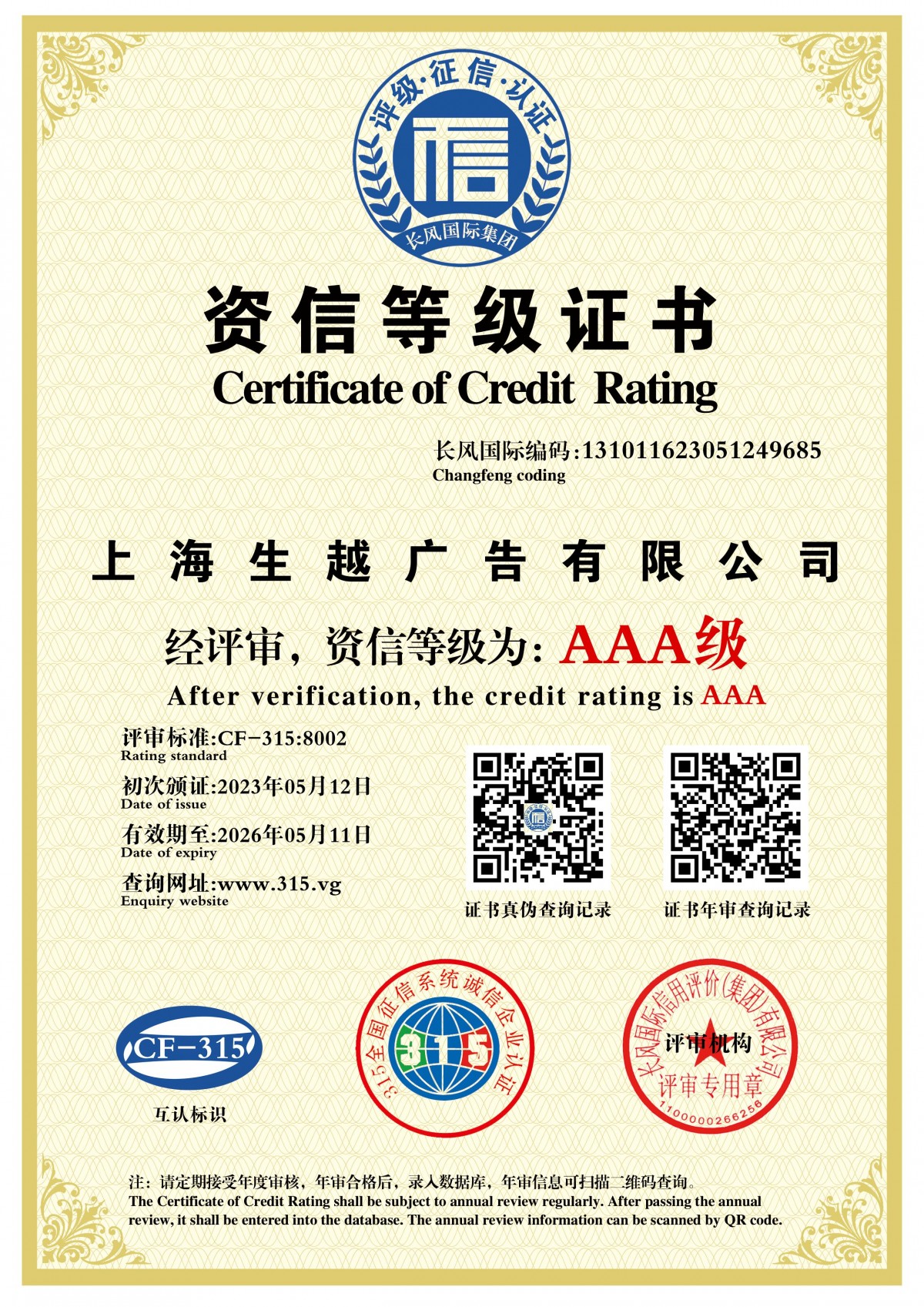 | Issuing Authority: | 长风国际认证 | Issue Date : | 2023-05-12 |