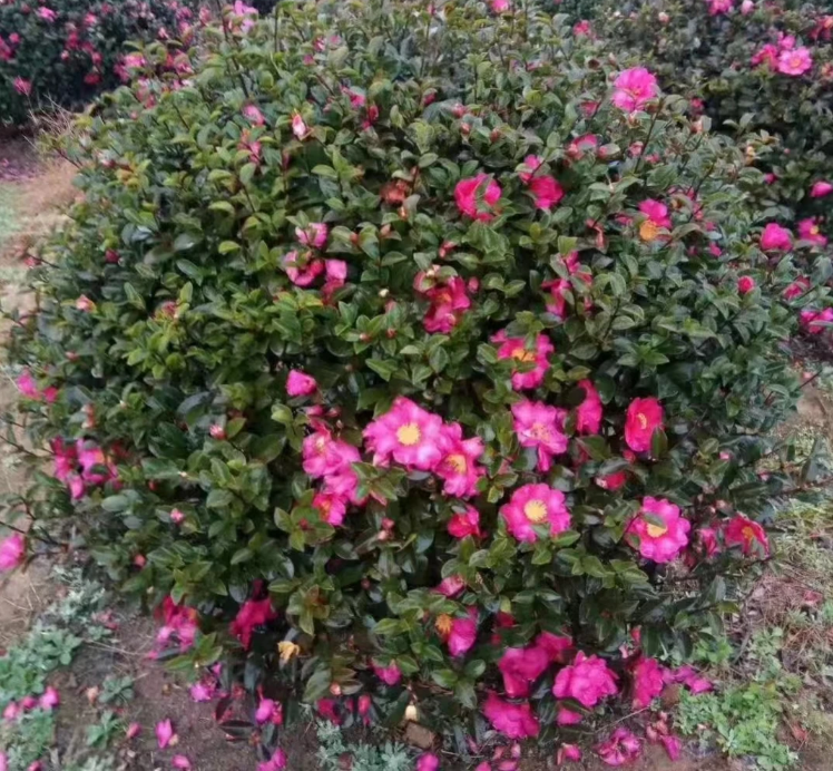 Evergreen shrub in the Camellia genus of the Theaceae family. Sparsely branched, young branches are hairy; leaves are leathery, elliptical, deep green and glossy above when dry, and brownish green below, hairless; flowers vary in size, buds and sepals are hairy, petals are broad oblong, red; fruit is spherical, seeds are brown, hairless; flowering period from November to March of the following year. Named "Camellia" due to its flower shape combining the characteristics of plum blossoms and camellias.