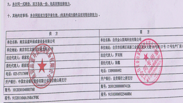 Unit of Signing Order:Zigong Jinshan Pump and Valve Technology Co., Ltd.