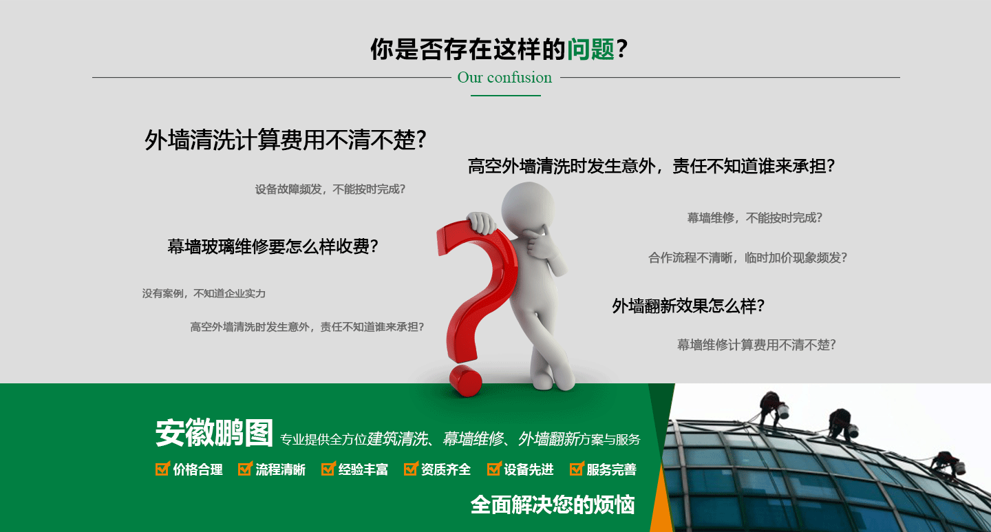 Anhui Pengtu Construction Labor Co., Ltd. was established in 2010. We are a comprehensive service company specializing in facade installation, renovation, maintenance, waterproofing projects, exterior building cleaning, high-altitude cleaning, exterior waterproofing, exterior renovation, and exterior insulation construction. Throughout this time, the company has consistently adhered to the business philosophy of customer-first, quality-oriented, and excellence-driven, ensuring customer satisfaction as the core of our service and always pursuing customer needs. Our company boasts a service team with years of industry experience, adeptly utilizing various innovative equipment and new technologies and methods, and consistently providing customers with appropriate services. Anhui Pengtu Construction Labor Co., Ltd. has been serving a variety of hotels, restaurants, entertainment venues, office buildings, schools, and corporate entities for many years. Our services include cleaning and m...