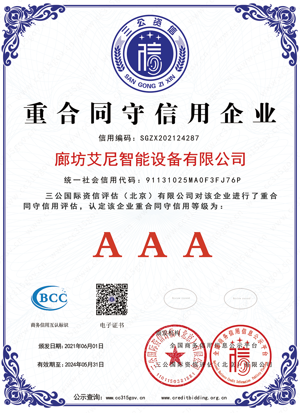 | Issuing Authority: | 三公国际资信评估(北京)有限公司 | Issue Date : | 2021-06-01 |