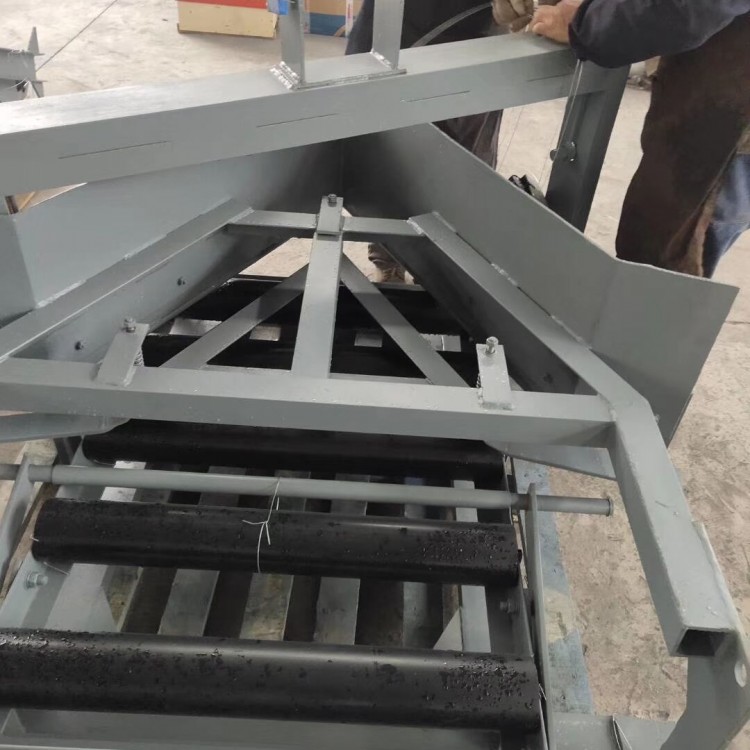 6. Lock-gas Section Usage: (1) Ensures even material distribution, preventing misalignment, material sticking, and spillage along the way. (2) Reduces induced airflow, slowing it down to less than 10% of the original speed. (3) Suitable for conveying sticky, wet, large pieces, powdery materials, and preventing clogging.Electromagnetic variable slot angle scraper unloader working principleThe electro-hydraulic犁式卸料机 is powered by an electric hydraulic push rod. During operation, the rod extends to act on the drive rod. Drive the frame forward, complete the lowering of the plow blade, and support the flat roller assembly, ensuring the belt working surface is flat. The lower edge of the plow blade is tightly sealed to the belt surface, depositing the material on the running belt into the hopper (chute) or at the desired location. Upon completion of unloading, activate the push rod to retract, pulling the frame backward, lifting the plow blade, and changing the variable groove angle roller assembly from flat to groove shape, restoring the belt working surface to a grooved state for smooth material passage; due to the use of hydraulic transmission in the electric hydraulic push rod, it features automatic overload protection.