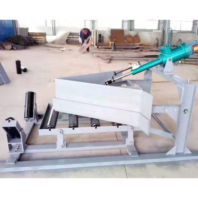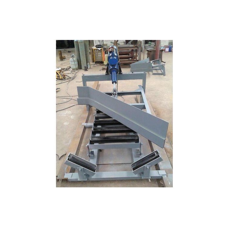 DYNT Type Single-Sided or Double-SidedAbrasion-resistantTraction-type unloading device, powered by an electro-hydraulic push rod. During operation, the push rod extends to drive the rod, propelling the frame forward to lower the head and support the flat roller assembly, ensuring the belt working surface is flat. The lower edge of the head is tightly sealed to the belt surface, depositing the material on the belt into the hopper and delivering it to the designated location. After unloading, the electro-hydraulic push rod is activated to retract the drive rod, pulling the frame backward, lifting the blade, and changing the roller assembly from parallel to trough shape, allowing the material to pass smoothly. (The principle of the electro-hydraulic push rod is explained in the push rod section.)