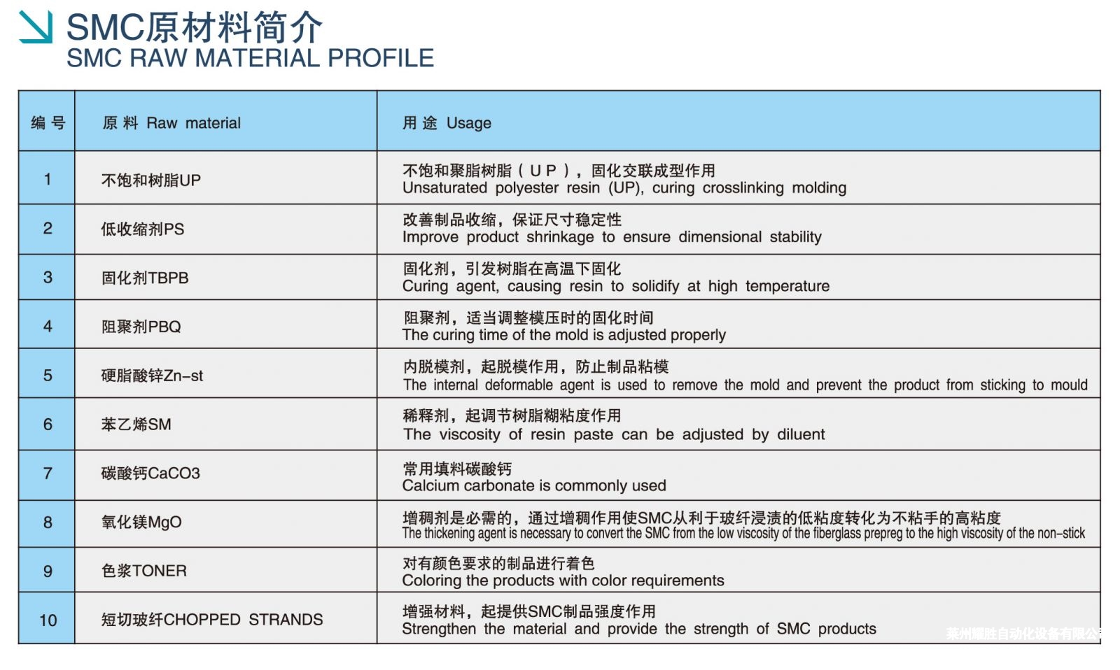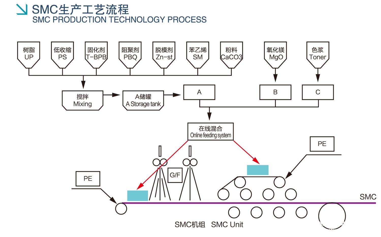 SMC stands for Sheet Molding Compound, a material mixed with various ingredients.Polyester szThe reinforced composite material obtained by impregnating glass fiber through a professional unit, covering both sides with plastic film, and pressing it into sheets after curing is placed in a high-precision mold heated to a certain temperature, and then pressure-formed into various required SMC fiberglass products. The SMC sheeting unit is a high-efficiency sheet production equipment developed by borrowing foreign technology based on the production process of SMC products.