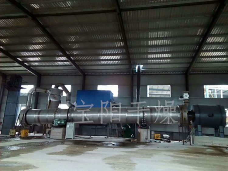 (二)滚筒式烘干机工作原理: 是将待干燥的湿物料由皮带输送机或斗式提升机送到料斗,然后经料斗的加料机通过加料管道进入加料端。加料管道的斜度要大于物料的自然倾角,以便物料顺利流入干燥器内。干燥器圆筒是一个与水平线略成倾斜的旋转圆筒。物料从较高一端加入,载热体由低端进入,与物料成逆流接触,也有载热体和物料一起并流进入筒体的。随着圆筒的转动物料受重力作用运行到较底的一端。湿物料在筒体内向前移动过程中,直接或间接得到了载热体的给热,使湿物料得以干燥,然后在出料端经皮带机或螺旋输送机送出。在筒体内壁上装有抄板,它的作用是把物料抄起来又撒下,使物料与气流的接触表面增大,以提高干燥速率并促进物料前进。载热体一般分为热空气、烟道气等。载热体经干燥器以后,一般需要旋风除尘器将气体内所带物料捕集下来。如需进一步减少尾气含尘量,还应经过袋式除尘器或湿法除尘器后再排放。