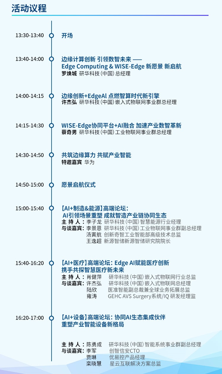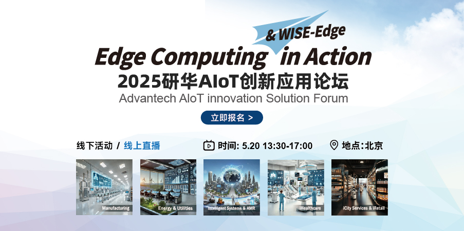 2025年5月-6月,将在北京、合肥、成都、深圳四城举办研华AIoT创新应用论坛, 本次活动以“Edge Computing & WISE-Edge in Action”为主题,聚焦Agentic AI 驱动下的边缘计算前瞻洞察、创新技术、云边协同、生态共创、产业革新,深入制造、能源、智能设备、机器人、医疗等产业,携手伙伴一起共探AI时代下的产业数智转型及创新发展。同时,现场也将会带来研华最新的Edge Computing &WISE-Edge技术与产品、创新应用及各产业解决方案,分享全球成功案例与产业经验。