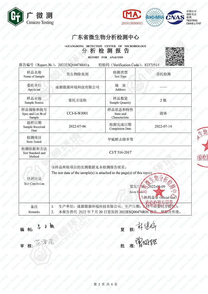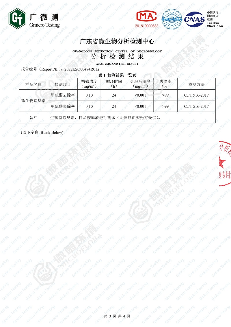 Honor Qualification Co., Ltd. > 除臭剂性能测试(甲硫醇、甲硫醚去除率)