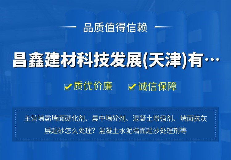 昌鑫建材科技发展(天津)有限公司是“昌鑫建材”水泥墙面起砂处理材料生产商,主营墙霸墙面硬化剂、晨中墙砼剂。产品质量有口皆碑货源充足,应用范围广。专业解决水泥抹灰砂浆强度不足、墙面起沙掉灰问题。昌鑫建材墙霸墙面硬化剂、晨中墙砼剂适用于水泥标号不达标、砂浆强度不足、找平层起灰起砂的墙面柱面抹灰砂浆层及水泥制品。材料施工方便,喷涂施工即可,1~2天即可提高水泥抹灰砂浆强度10~60%。