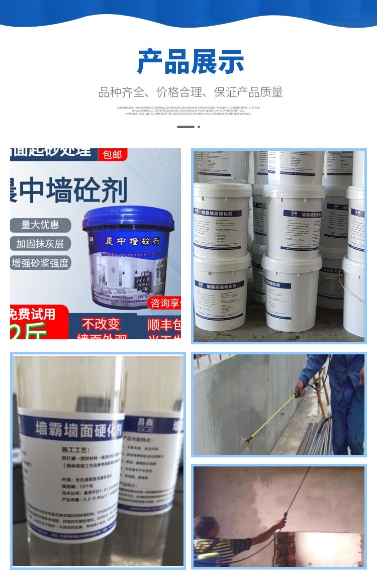 晨中墙砼剂、墙霸墙面硬化剂厂家——昌鑫建材科技公司、专业研发团队推出水泥抹灰砂浆墙面起砂处理材料,帮您解决水泥抹灰砂浆强度不足、墙面起砂掉粉等现象。提高砂浆强度、硬化砂浆层、增加水泥抹灰的强度硬度的效果显著。昌鑫建材墙面起砂处理剂按照工艺施工后二天即可大幅度提高砂浆强度、帮您顺利通过验收。使用前请查看施工工艺中的使用方法及注意事项,以保证墙霸墙面硬化剂的使用效果。厂家直销、提供技术指导,一站式服务,欢迎来电咨询!