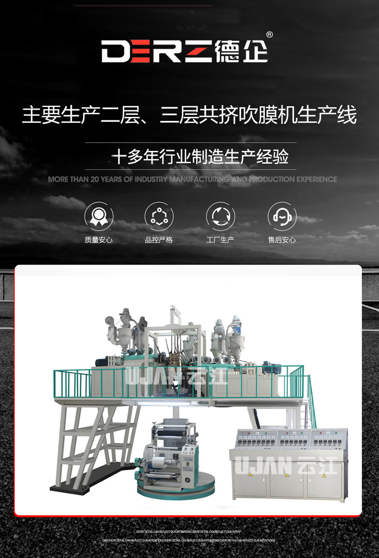 SJ系列水冷式多层共挤薄膜吹塑机组,是我公司引进德国先进技术自行研制的下吹水冷带旋转牵引的高性能、全自 动薄膜吹塑机组。该机采用下吹及自溢水冷法生产制品,其制品具有很高的透明度和良好的性能,达到国际先进水 平,并且有纠偏装置、电晕处理、静电消除及自动精密温度控制等装置供客户选配。其中多层共挤机型适合加工PP、 PE、PA、LLDPE、MLLDPE、HV等原料,所生产的制品还具有良好的阻隔性、热封性,耐低温性和力学性能,为理想的商品包装材料。