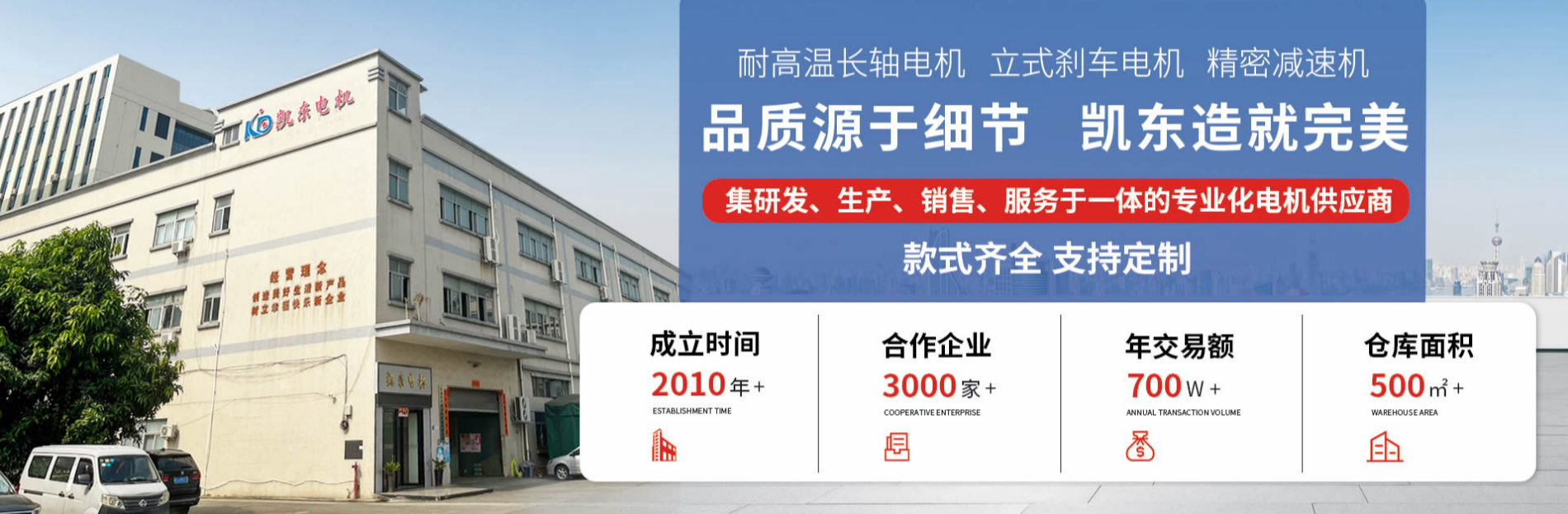 Kai Dong Electromotor Co., Ltd. was established in 2010, with its headquarters located in Dongguan, Guangdong Province, known as the "Capital of China's Manufacturing." It is a high-tech enterprise specializing in the research, development, production, sales, and service of motors. With its advanced technological capabilities, stringent quality control, and comprehensive service system, the company has become one of the key suppliers in the domestic motor industry.