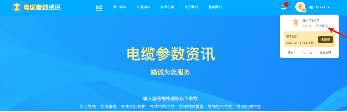 Upon entering the software website, click "Register" or "Login" in the upper-right corner of the webpage. After successful login, place the mouse over the user nickname area, and a dropdown menu will appear. Click on "Personal Account" or "Personal Center," as shown in the following image: