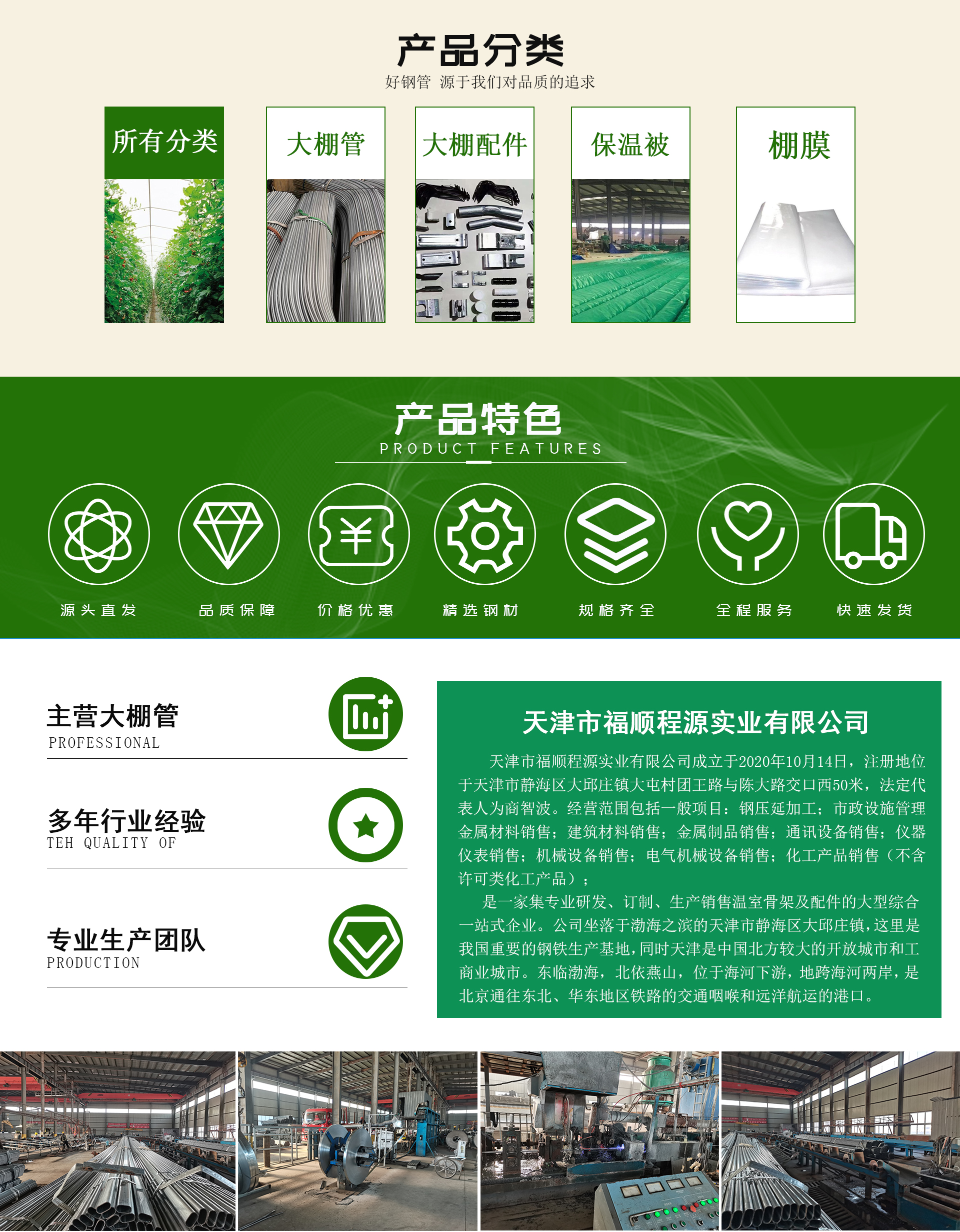 Tianjin Fushun Chengyuan Industrial Co., Ltd.A large comprehensive one-stop enterprise specializing in the research and development, customization, production, and sales of greenhouse frames and accessories. The company is located in Datouzhuang Town, Jinghai District, Tianjin City, situated by the Bohai Sea, which is a significant steel production base in China. Tianjin, a major open city and commercial hub in northern China, borders the Bohai to the east and the Yan Mountains to the north. It lies downstream of the Haihe River, spanning both sides of the river, and serves as a crucial transportation hub for rail access to Northeast and East China regions, as well as a port for ocean shipping.The company boasts state-of-the-art laser cutting equipment with high speed, precision, quality, and stability, suitable for cutting plates of various materials and thicknesses. Through the full-automated laser tube cutting technology, it effectively overcomes the technical bottleneck in tube ...