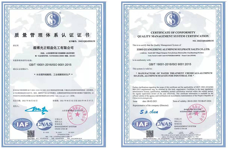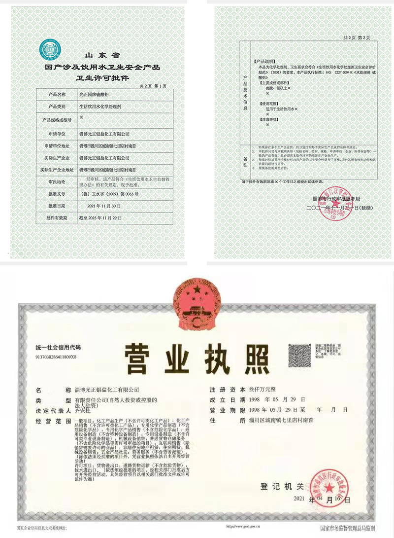 Zibo Guangzheng Aluminum Salt Chemical Industry Co., Ltd. is a subsidiary of Shandong Guangzheng Information Technology Co., Ltd. Established in 1989, the company currently boasts a 150,000 tons annual design capacity for industrial aluminum sulfate and 80,000 tons of iron-free aluminum sulfate. It is a leading producer of industrial aluminum sulfate and water treatment agents in China. Our company was the first in the industry to obtain the ISO9002:1994 quality system certification in 1998, followed by the ISO14001:1996 environmental management system certification in 2002. The same year, we successfully transitioned to the ISO9001:2000 quality management system and obtained the drinking water treatment agent license from the Shandong Provincial Health Department. In 2005, we obtained the import and export rights for our products. Due to its stable quality, the company has been awarded several honors, including the "Quality Trustworthy Enterprise" by the National Administration of Quality Supervision, Inspection, and Quarantine.