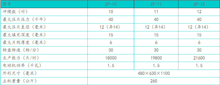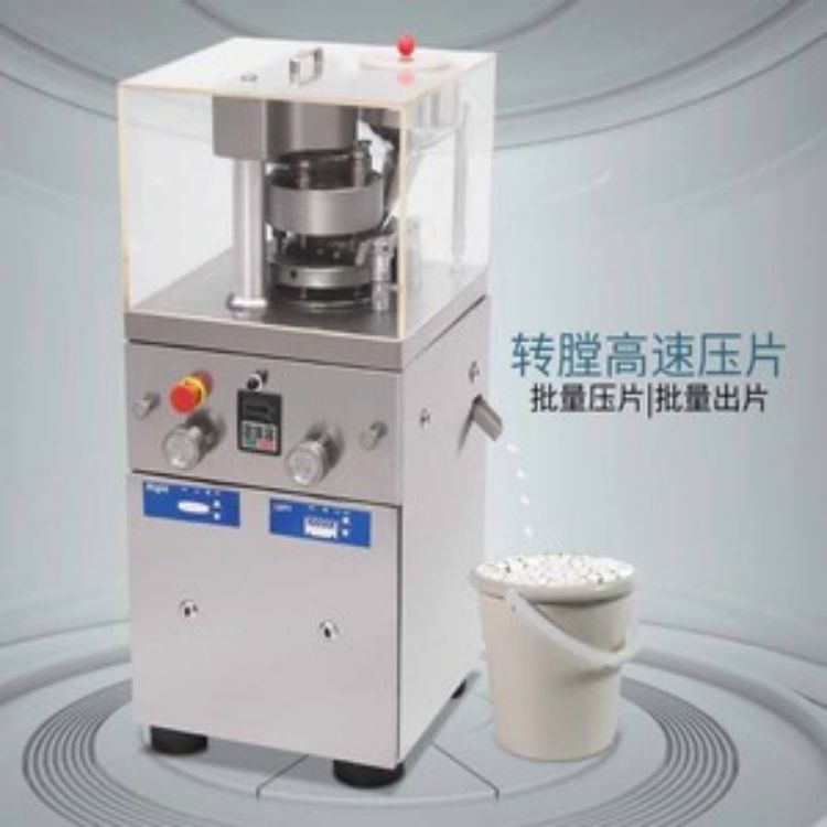 一、主要用途: 本机是一种单压式自动旋转,连续压片的机器,将颗料状原料压制成各种片剂。它主要用于片剂生产,同时适用于化工、食品、电子等工业部门。外围罩壳为全封闭形式,材料采用不锈钢,内部台面用不锈钢材料,转台表面经过特殊处理,能保持表面光泽与防止交叉污染,符合GMP要求。装有透明玻璃的门窗,能清楚观察压片的状态,并且能全部打开,易于内部清理和保养。所有控制器和操作件均布局合理。采用变频调速装置进行电气调速,操作方便,转动平稳,安全准确。所有的传动装置均布置在机器内部,保持机件清洁。配有过载保护装置,当压力过载时,能自动停机。本机配有电磁制动电动机和其它安全保护装置,运行时也能调整与操作。 二、主要技术参数: